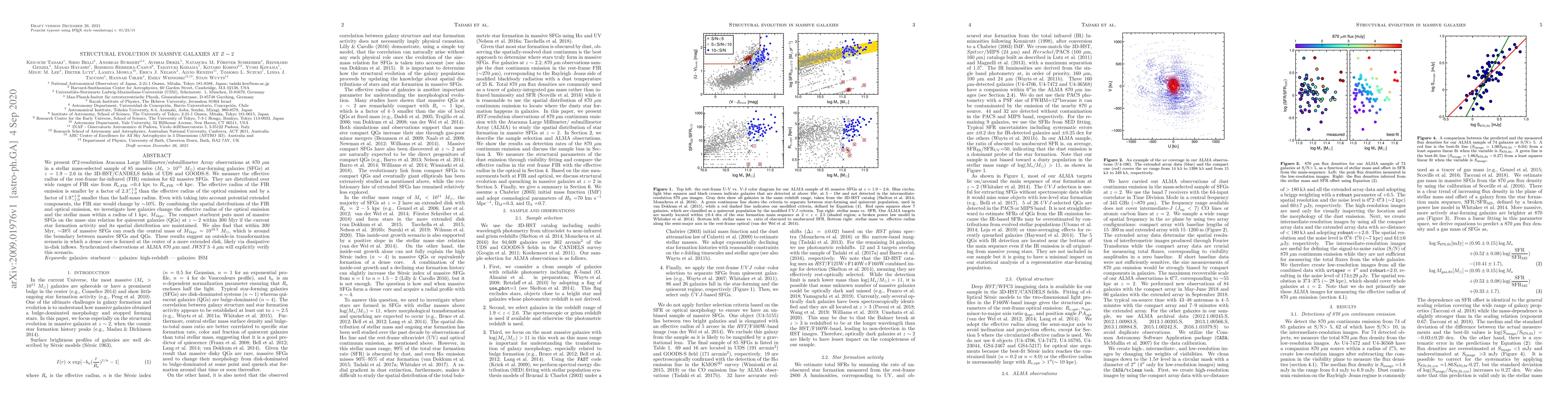 We present 0.2arcsec-resolution Atacama Large Millimeter/submillimeter Array observations at 870 $\mu$m in a stellar mass-selected sample of 85 massive ($M_\mathrm{star}>10^{11}~M_\odot$) star-forming galaxies (SFGs) at z=1.9-2.6 in the 3D-HST/CANDELS fields of UDS and GOODS-S. We measure the effective radius of the rest-frame far-infrared (FIR) emission for 62 massive SFGs. They are distributed over wide ranges of FIR size from $R_\mathrm{e,FIR}=$0.4 kpc to $R_\mathrm{e,FIR}=$6 kpc. The effective radius of the FIR emission is smaller by a factor of 2.3$^{+1.9}_{-1.0}$ than the effective radius of the optical emission and by a factor of 1.9$^{+1.9}_{-1.0}$ smaller than the half-mass radius. Even with taking into account potential extended components, the FIR size would change by ~10%. By combining the spatial distributions of the FIR and optical emission, we investigate how galaxies change the effective radius of the optical emission and the stellar mass within a radius of 1 kpc, $M_\mathrm{1kpc}$. The compact starburst puts most of massive SFGs on the mass--size relation for quiescent galaxies (QGs) at z~2 within 300 Myr if the current star formation activity and its spatial distribution are maintained. We also find that within 300 Myr, ~38% of massive SFGs can reach the central mass of $M_\mathrm{1kpc}=10^{10.5}~M_\odot$, which is around the boundary between massive SFGs and QGs. These results suggest an outside-in transformation scenario in which a dense core is formed at the center of a more extended disk, likely via dissipative in-disk inflows. Synchronized observations at ALMA 870 $\mu$m and JWST 3-4 $\mu$m will explicitly verify this scenario.