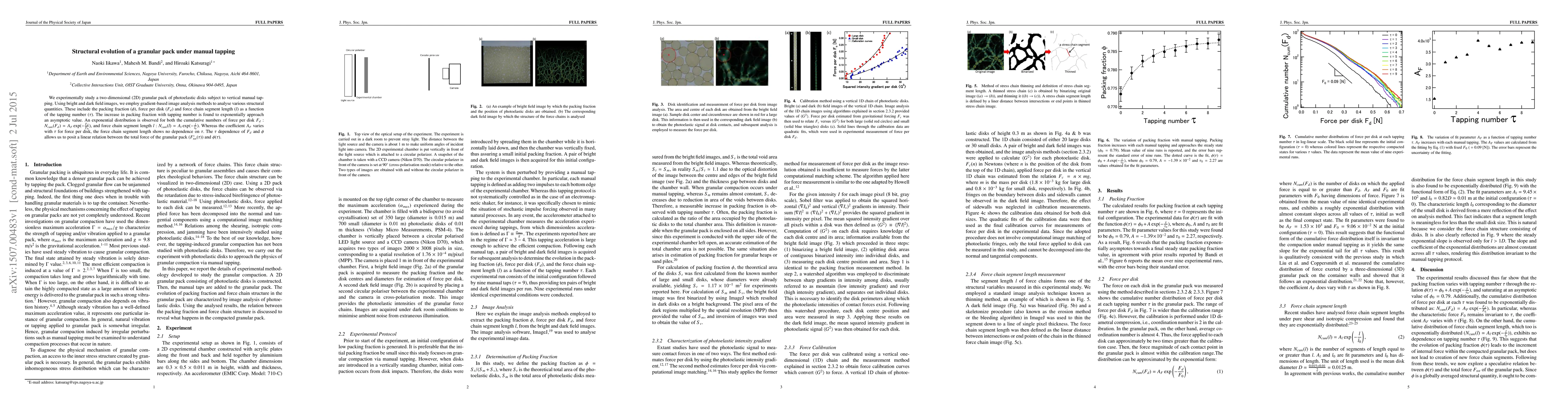 This study investigates the structural evolution of a 2D granular pack of photoelastic disks under manual tapping, revealing an exponential increase in packing fraction approaching an asymptotic value. The force per disk and force chain segment length follow exponential distributions, with the former varying with tapping number while the latter remains constant.