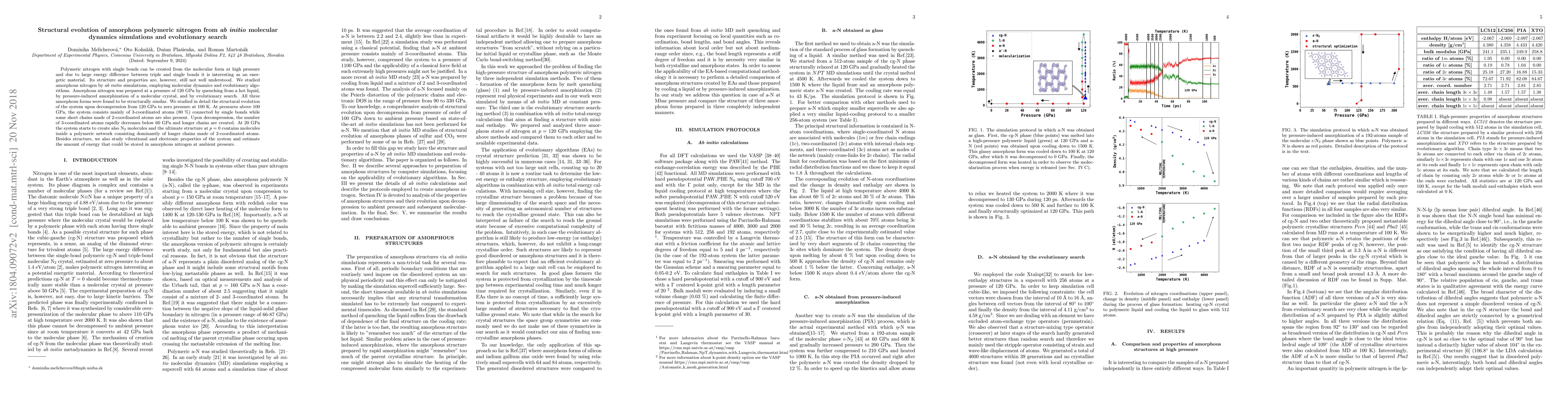Polymeric nitrogen with single bonds can be created from the molecular form at high pressure and due to large energy difference between triple and single bonds it is interesting as energetic material. Its structure and properties are, however, still not well understood. We studied amorphous nitrogen by \textit{ab initio} simulations, employing molecular dynamics and evolutionary algorithms. Amorphous nitrogen was prepared at pressure of 120 GPa by quenching from hot liquid, by pressure-induced amorphization of molecular crystal and by evolutionary search. All three amorphous forms were found to be structurally similar. We studied in detail the structural evolution of the system upon decompression from 120 GPa to zero pressure at 100 K. At pressures above 100 GPa, system consists mainly of 3-coordinated atoms (80 \%) connected by single bonds while some short chains made of 2-coordinated atoms are also present. Upon decompression, the number of 3-coordinated atoms rapidly decreases below 60 GPa and longer chains are created. At 20 GPa the system starts to create also N$_2$ molecules and the ultimate structure at $p=0$ contains molecules inside a polymeric network consisting dominantly of longer chains made of 2-coordinated atoms. Besides structure, we also study vibrational and electronic properties of the system and estimate the amount of energy that could be stored in amorphous nitrogen at ambient pressure.