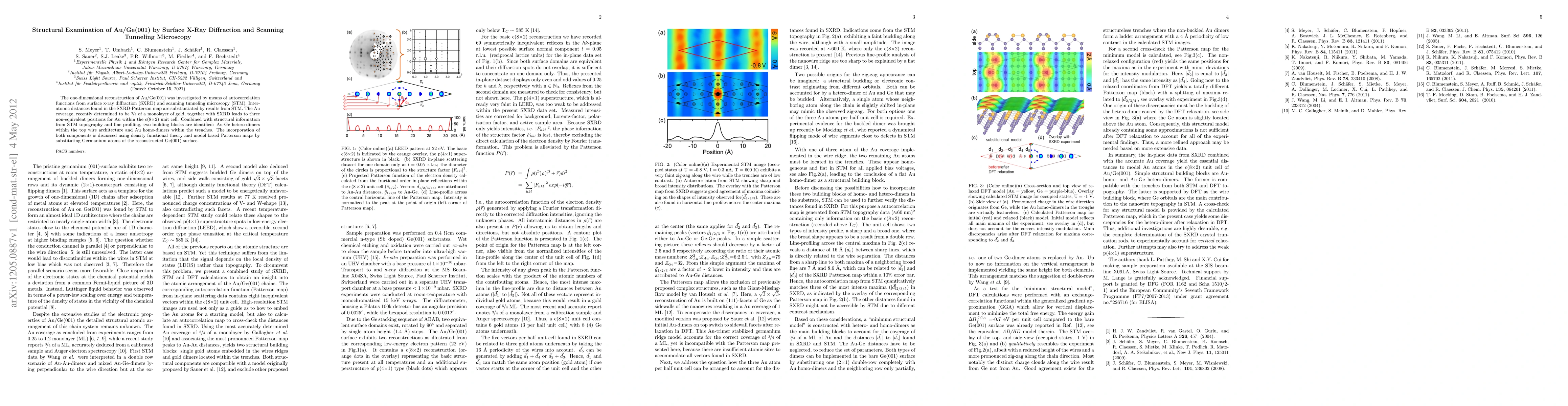 This study investigates the one-dimensional Au/Ge(001) reconstruction using surface x-ray diffraction and scanning tunneling microscopy, identifying three non-equivalent Au positions within the c(8x2) unit cell. The findings are corroborated by STM and suggest Au-Ge hetero-dimers and Au homo-dimers, supported by density functional theory.