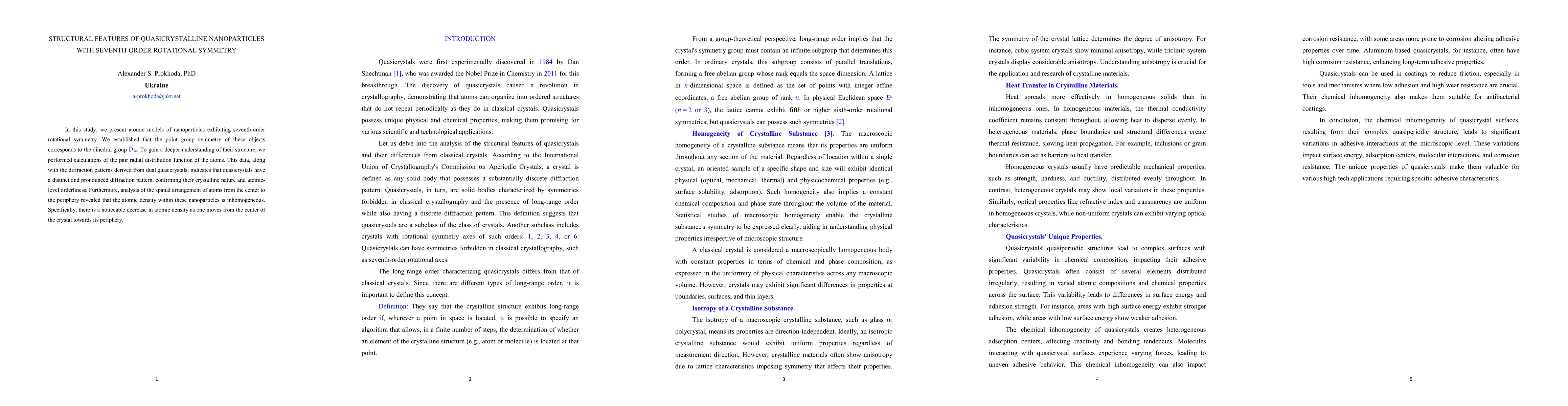 This study presents atomic models of quasicrystalline nanoparticles with seventh-order rotational symmetry, identified by the dihedral group D7v, and reveals an inhomogeneous atomic density distribution, decreasing from the center to the periphery, confirmed by distinct quasicrystalline diffraction patterns.