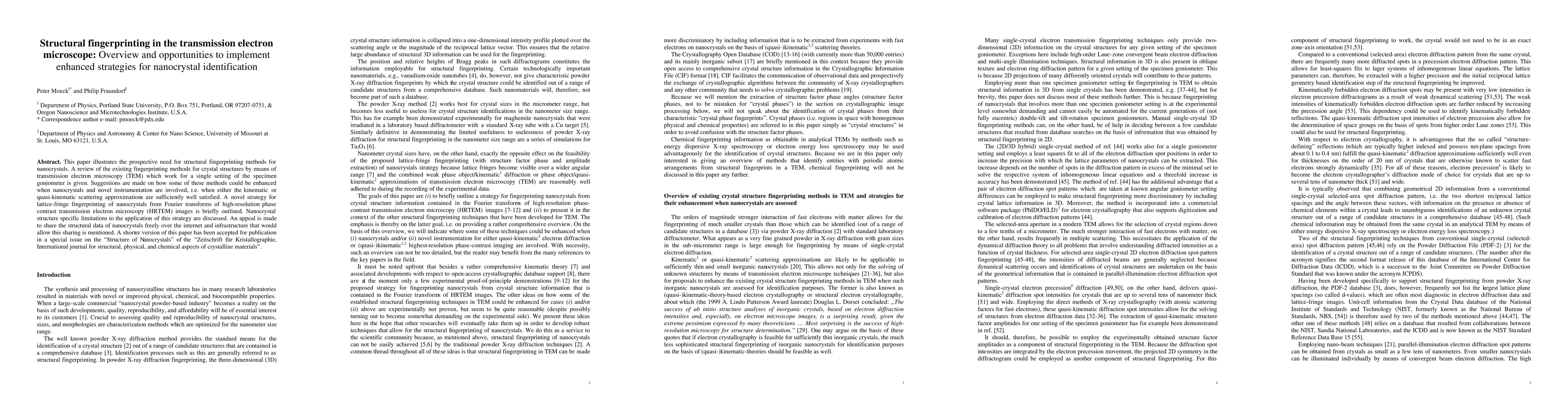 This paper illustrates the prospective need for structural fingerprinting methods for nanocrystals. A review of the existing fingerprinting methods for crystal structures by means of transmission electron microscopy which work for a single setting of the specimen goniometer is given. Suggestions are made on how some of these methods could be enhanced when nanocrystals and novel instrumentation are involved, i.e. when either the kinematic or quasi-kinematic scattering approximations are sufficiently well satisfied. A novel strategy for lattice-fringe fingerprinting of nanocrystals from Fourier transforms of high-resolution phase contrast transmission electron microscopy images is briefly outlined. Nanocrystal structure specific limitations to the application of this strategy are discussed. An appeal is made to share the structural data of nanocrystals freely over the internet and infrastructure that would allow this sharing is mentioned. A shorter version of this paper has been accepted for publication in a special issue on the Structure of Nanocrystals of the Zeitschrift fuer Kristallographie, International journal for structural, physical, and chemical aspects of crystalline materials.
