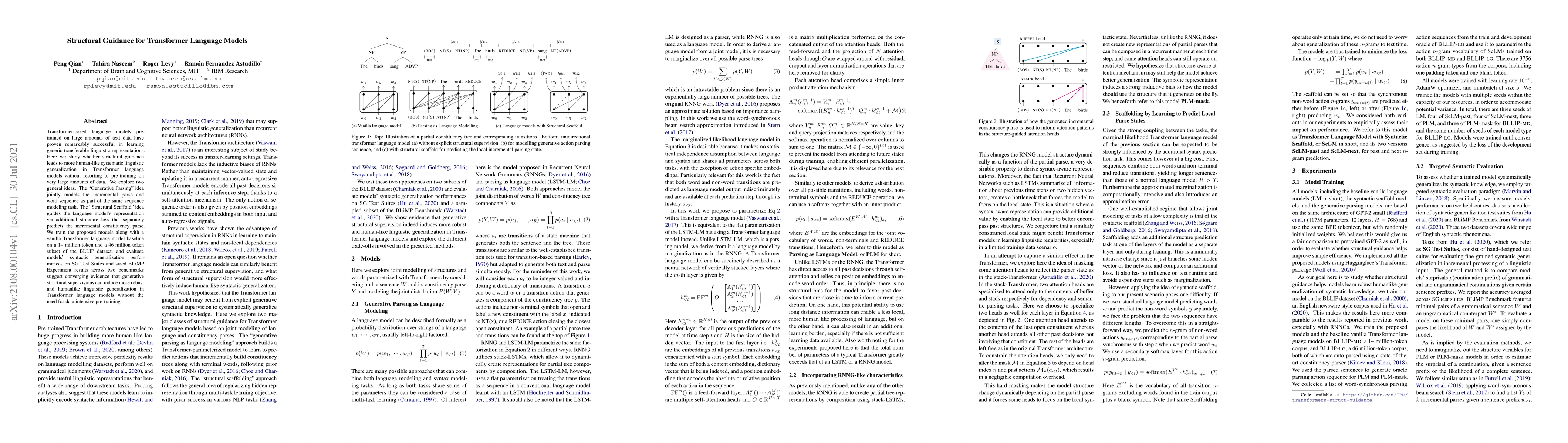 This paper investigates whether structural guidance can improve Transformer language models' linguistic generalization without extensive pre-training. It proposes two methods: "Generative Parsing" and "Structural Scaffold," which integrate syntactic structure into the model. Results show that these methods lead to more human-like linguistic generalization compared to a baseline model.
