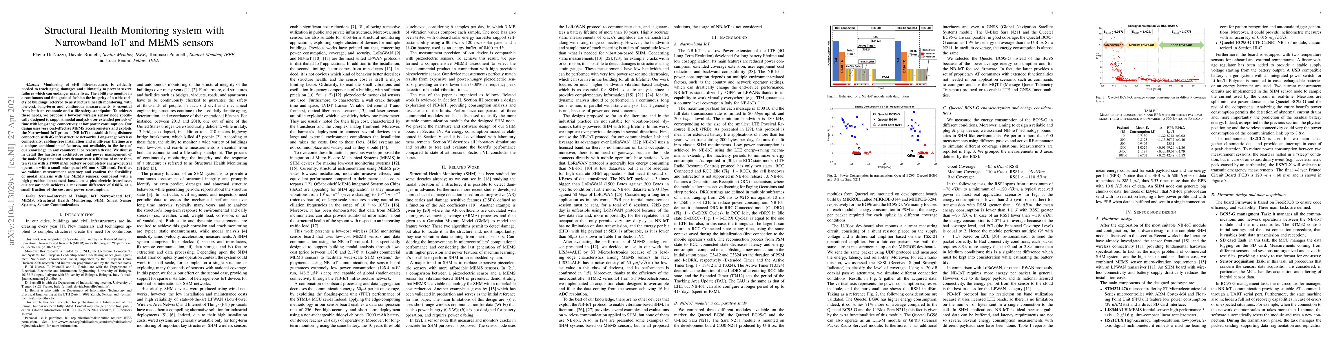 Monitoring of civil infrastructures is critically needed to track aging, damages and ultimately to prevent severe failures which can endanger many lives. The ability to monitor in a continuous and fine-grained fashion the integrity of a wide variety of buildings, referred to as structural health monitoring, with low-cost, long-term and continuous measurements is essential from both an economic and a life-safety standpoint. To address these needs, we propose a low-cost wireless sensor node specifically designed to support modal analysis over extended periods of time with long-range connectivity at low power consumption. Our design uses very cost-effective MEMS accelerometers and exploits the Narrowband IoT protocol (NB-IoT) to establish long-distance connection with 4G infrastructure networks. Long-range wireless connectivity, cabling-free installation and multi-year lifetime are a unique combination of features, not available, to the best of our knowledge, in any commercial or research device. We discuss in detail the hardware architecture and power management of the node. Experimental tests demonstrate a lifetime of more than ten years with a 17000 mAh battery or completely energy-neutral operation with a small solar panel (60 mm x 120 mm). Further, we validate measurement accuracy and confirm the feasibility of modal analysis with the MEMS sensors: compared with a high-precision instrument based on a piezoelectric transducer, our sensor node achieves a maximum difference of 0.08% at a small fraction of the cost and power consumption.