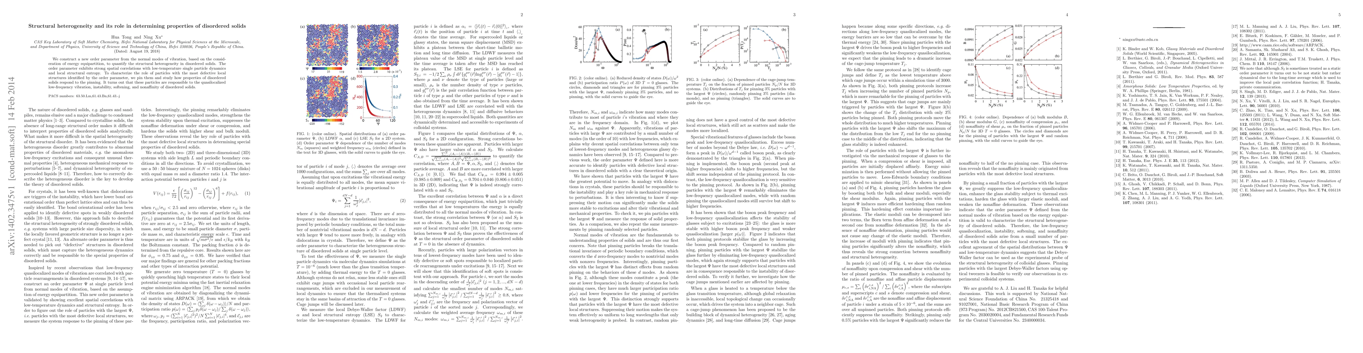 The research constructs a new order parameter (Ψ) from normal modes of vibration, based on energy equipartition, to quantify structural heterogeneity in disordered solids. It characterizes particles with the most defective local structures identified by Ψ, pinning them to study the response of disordered solid properties.