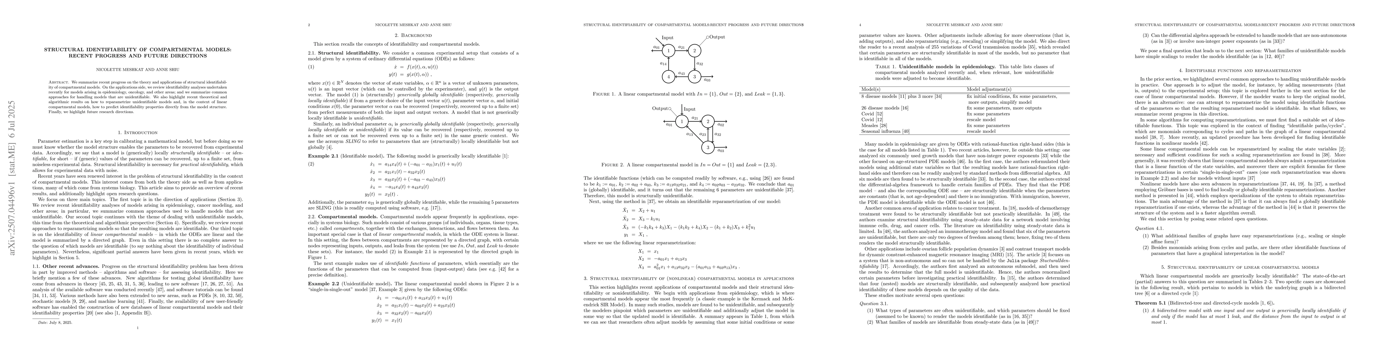 We summarize recent progress on the theory and applications of structural identifiability of compartmental models. On the applications side, we review identifiability analyses undertaken recently for models arising in epidemiology, oncology, and other areas; and we summarize common approaches for handling models that are unidentifiable. We also highlight recent theoretical and algorithmic results on how to reparametrize unidentifiable models and, in the context of linear compartmental models, how to predict identifiability properties directly from the model structure. Finally, we highlight future research directions.