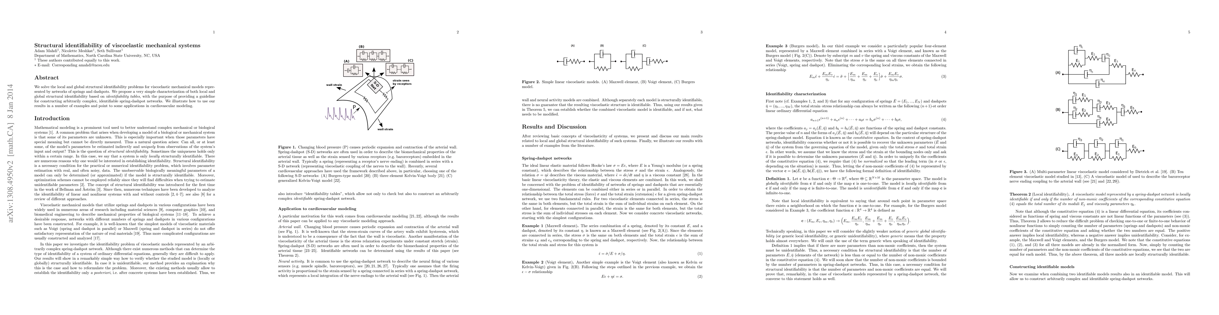 This paper addresses the structural identifiability of viscoelastic mechanical systems modeled by spring-dashpot networks, proposing a straightforward characterization using identifiability tables to guide the construction of identifiable models. It also demonstrates applications in cardiovascular modeling.