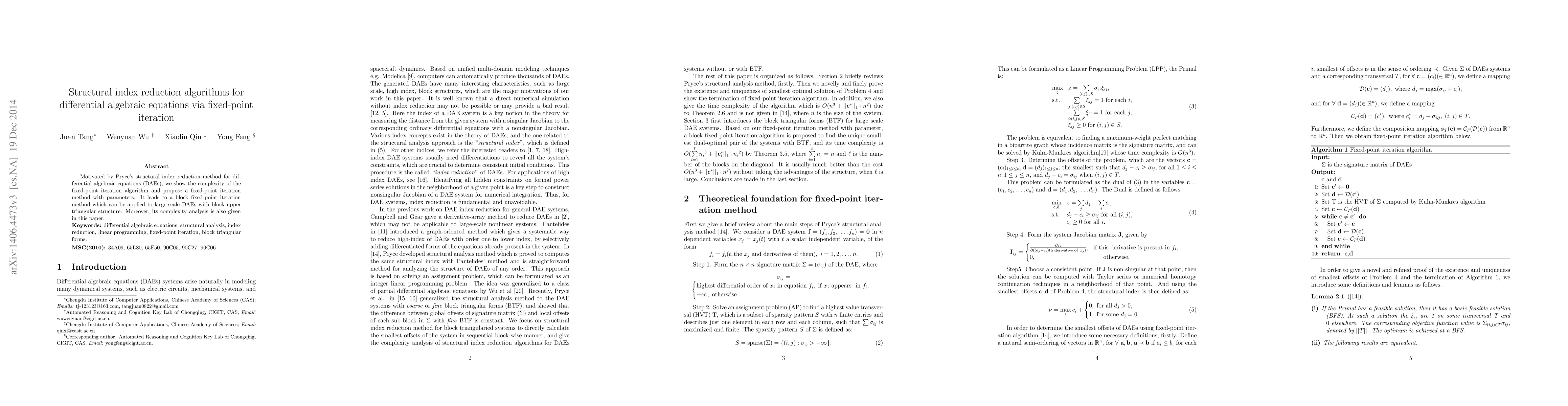 Motivated by Pryce's structural index reduction method for differential algebraic equations (DAEs), we show the complexity of the fixed-point iteration algorithm and propose a fixed-point iteration method with parameters. It leads to a block fixed-point iteration method which can be applied to large-scale DAEs with block upper triangular structure. Moreover, its complexity analysis is also given in this paper.