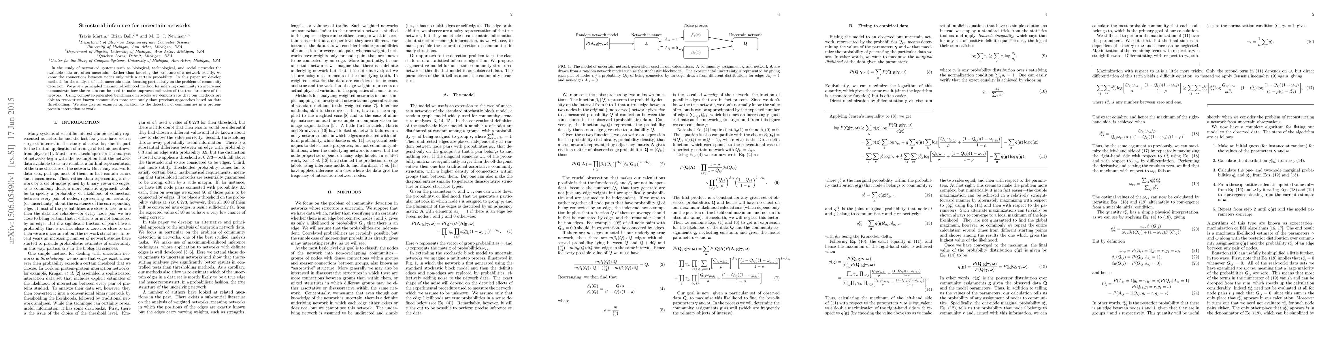 In the study of networked systems such as biological, technological, and social networks the available data are often uncertain. Rather than knowing the structure of a network exactly, we know the connections between nodes only with a certain probability. In this paper we develop methods for the analysis of such uncertain data, focusing particularly on the problem of community detection. We give a principled maximum-likelihood method for inferring community structure and demonstrate how the results can be used to make improved estimates of the true structure of the network. Using computer-generated benchmark networks we demonstrate that our methods are able to reconstruct known communities more accurately than previous approaches based on data thresholding. We also give an example application to the detection of communities in a protein-protein interaction network.