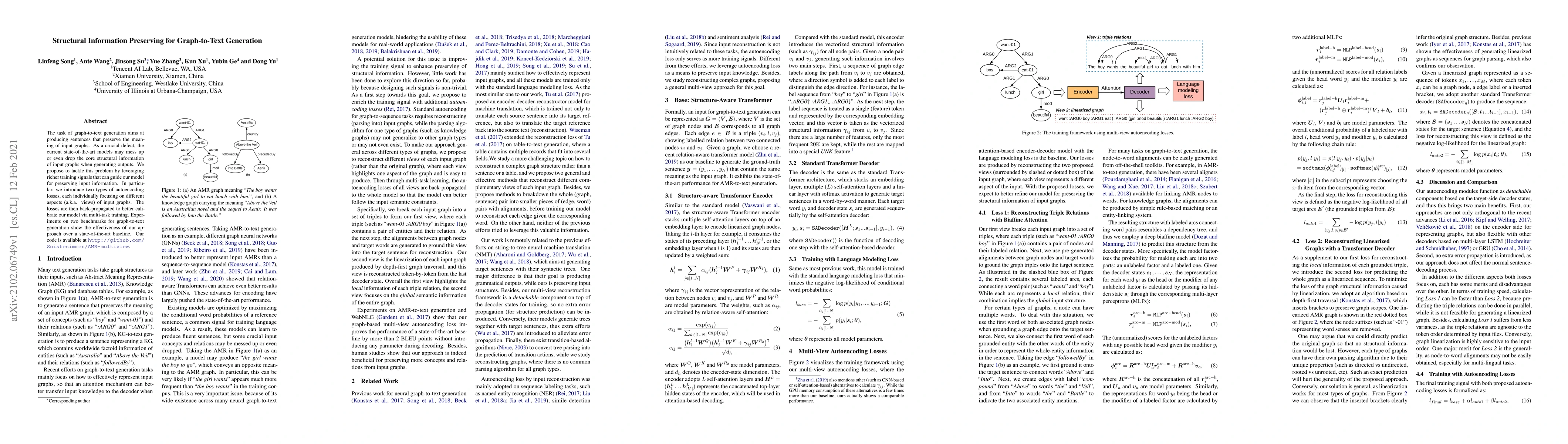 The task of graph-to-text generation aims at producing sentences that preserve the meaning of input graphs. As a crucial defect, the current state-of-the-art models may mess up or even drop the core structural information of input graphs when generating outputs. We propose to tackle this problem by leveraging richer training signals that can guide our model for preserving input information. In particular, we introduce two types of autoencoding losses, each individually focusing on different aspects (a.k.a. views) of input graphs. The losses are then back-propagated to better calibrate our model via multi-task training. Experiments on two benchmarks for graph-to-text generation show the effectiveness of our approach over a state-of-the-art baseline. Our code is available at \url{http://github.com/Soistesimmer/AMR-multiview}.