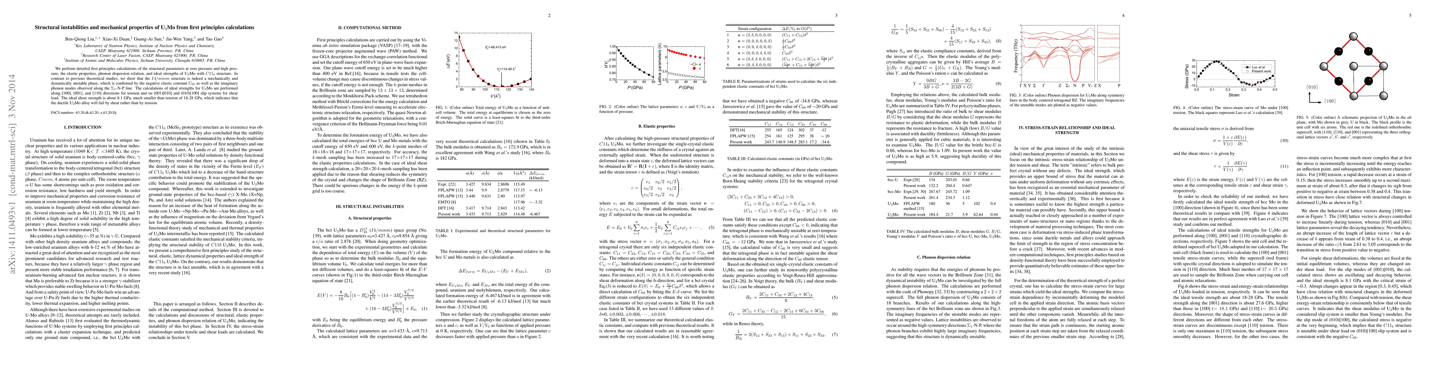 This study reveals that U$_2$Mo with $I4/mmm$ structure is mechanically and dynamically unstable, evidenced by negative elastic constant $C_{66}$ and imaginary phonon modes. The ideal shear strength is much lower than the tension strength, indicating that U$_2$Mo will fail by shear rather than tension.