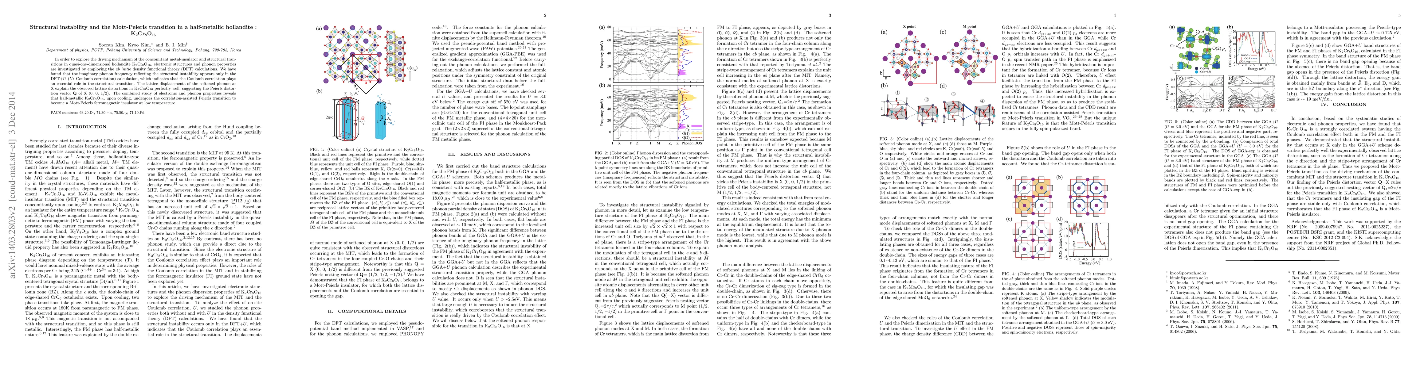 In order to explore the driving mechanism of the concomitant metal-insulator and structural transitions in quasi-one-dimensional hollandite K$_{2}$Cr$_{8}$O$_{16}$, electronic structures and phonon properties are investigated by employing the {\it ab initio} density functional theory (DFT) calculations. We have found that the imaginary phonon frequency reflecting the structural instability appears only in the DFT+$U$ ($U$: Coulomb correlation) calculation, which indicates that the Coulomb correlation plays an essential role in the structural transition. The lattice displacements of the softened phonon at X explain the observed lattice distortions in K$_{2}$Cr$_{8}$O$_{16}$ perfectly well, suggesting the Peierls distortion vector {\bf Q} of X (0, 0, 1/2). The combined study of electronic and phonon properties reveals that half-metallic K$_{2}$Cr$_{8}$O$_{16}$, upon cooling, undergoes the correlation-assisted Peierls transition to become a Mott-Peierls ferromagnetic insulator at low temperature.