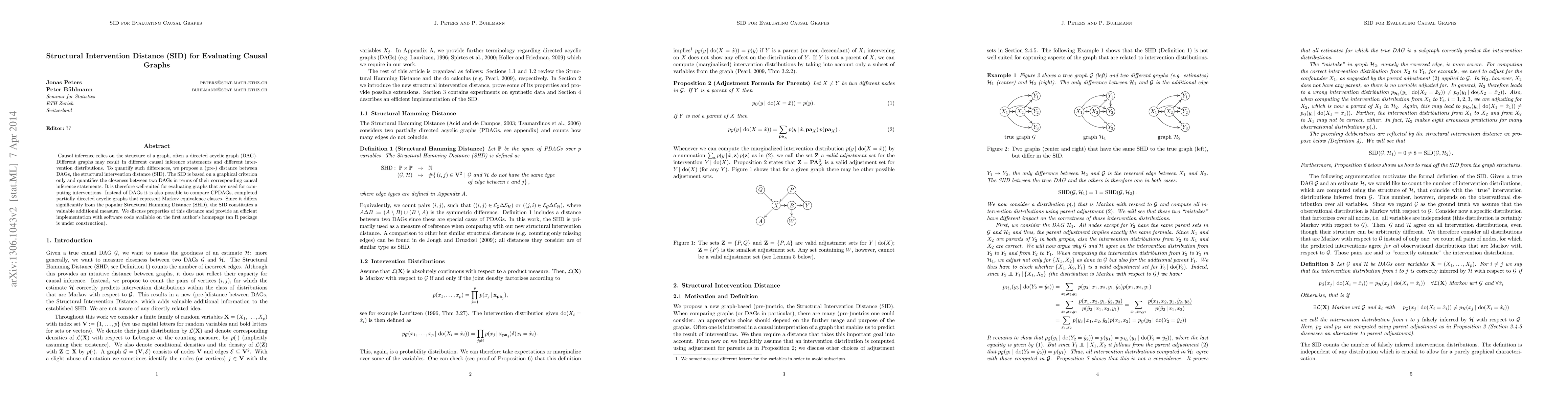 This paper proposes the Structural Intervention Distance (SID), a new (pre-)distance measure for evaluating the similarity between directed acyclic graphs (DAGs) based on their causal inference statements. Unlike the Structural Hamming Distance, SID focuses on the graphical structure and is particularly useful for comparing graphs used for intervention computations.