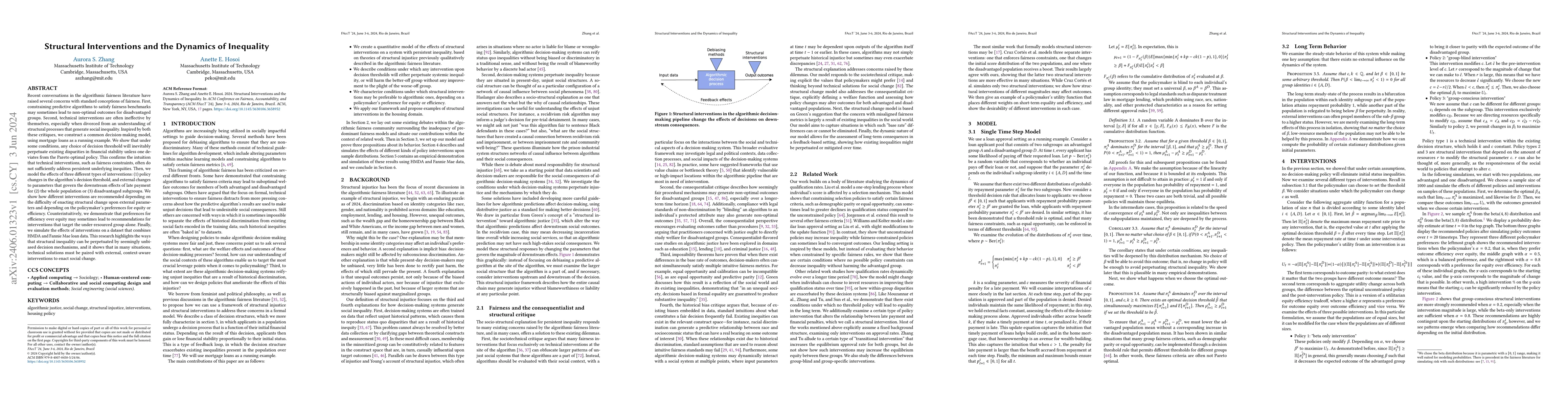 This paper examines how algorithmic fairness interventions may inadvertently perpetuate inequality and highlights the necessity of structural changes alongside technical solutions. It models different interventions and finds that preferences for efficiency over equity can lead to recommendations favoring under-resourced groups, emphasizing the complex interplay between equity, efficiency, and structural dynamics in addressing social inequality.