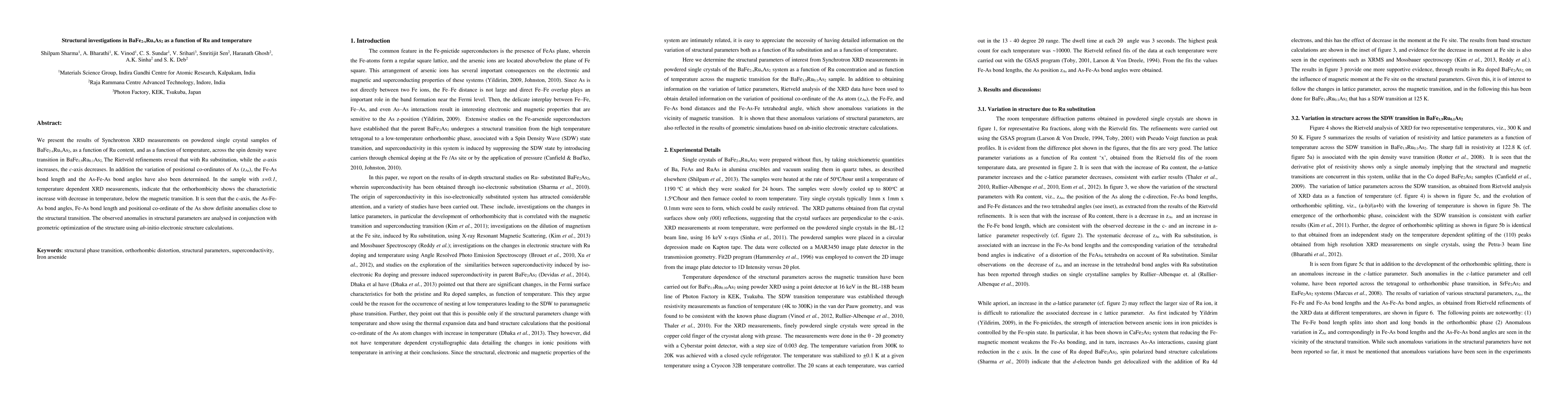 Researchers studied the structural properties of BaFe2-xRuxAs2 at different Ru concentrations and temperatures, finding that the material's structure changes with temperature, particularly around a transition point, and that first-principles simulations support these findings.