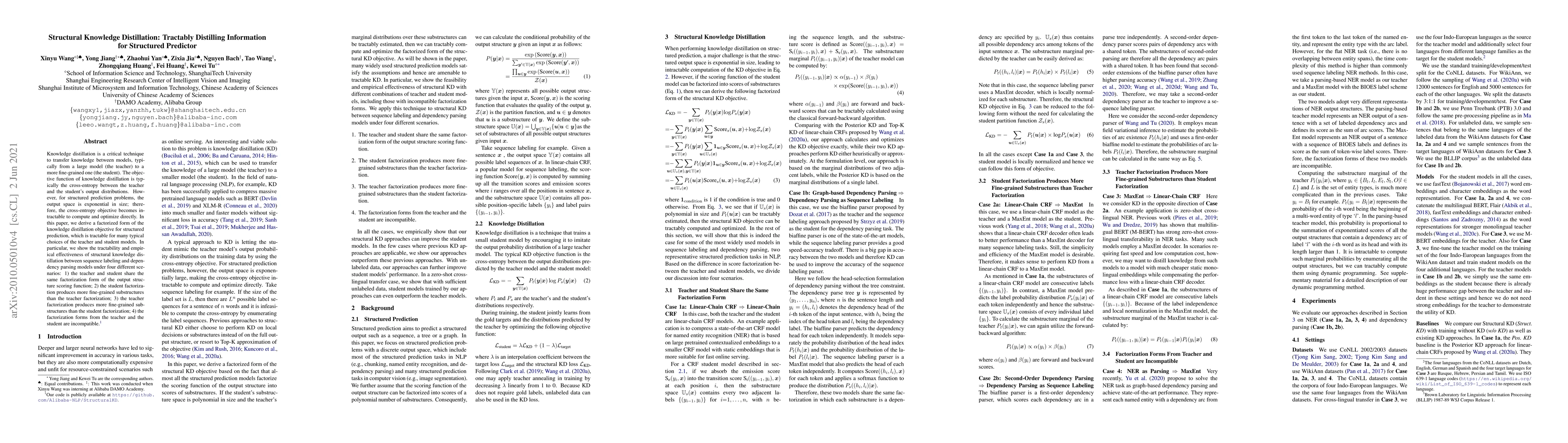 This paper proposes a factorized form of the knowledge distillation objective for structured prediction problems, making it tractable to compute and optimize. It demonstrates the effectiveness of structural knowledge distillation in four scenarios involving sequence labeling and dependency parsing models.