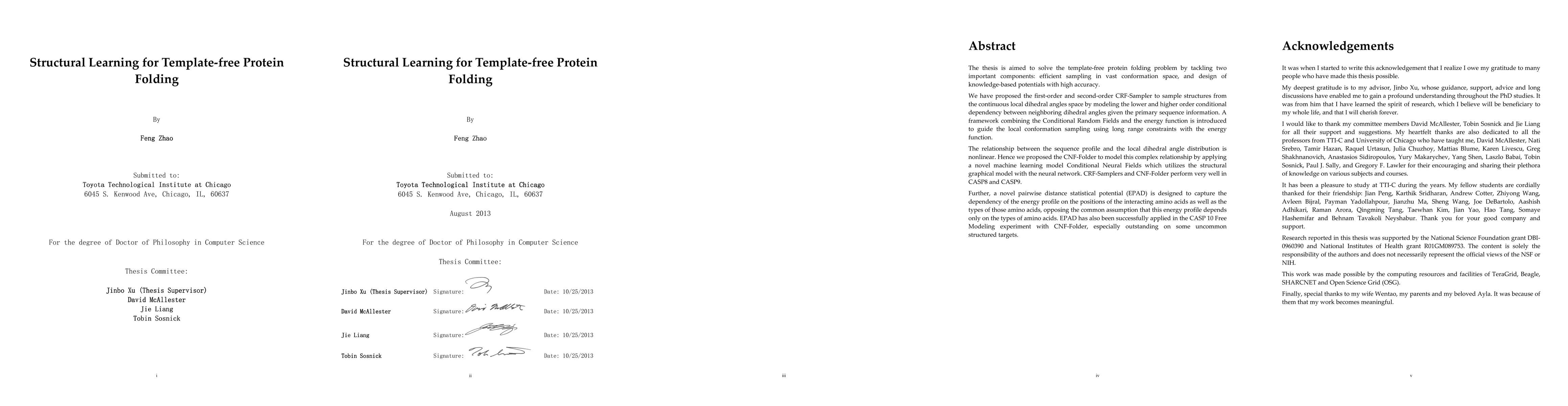 The thesis is aimed to solve the template-free protein folding problem by tackling two important components: efficient sampling in vast conformation space, and design of knowledge-based potentials with high accuracy. We have proposed the first-order and second-order CRF-Sampler to sample structures from the continuous local dihedral angles space by modeling the lower and higher order conditional dependency between neighboring dihedral angles given the primary sequence information. A framework combining the Conditional Random Fields and the energy function is introduced to guide the local conformation sampling using long range constraints with the energy function. The relationship between the sequence profile and the local dihedral angle distribution is nonlinear. Hence we proposed the CNF-Folder to model this complex relationship by applying a novel machine learning model Conditional Neural Fields which utilizes the structural graphical model with the neural network. CRF-Samplers and CNF-Folder perform very well in CASP8 and CASP9. Further, a novel pairwise distance statistical potential (EPAD) is designed to capture the dependency of the energy profile on the positions of the interacting amino acids as well as the types of those amino acids, opposing the common assumption that this energy profile depends only on the types of amino acids. EPAD has also been successfully applied in the CASP 10 Free Modeling experiment with CNF-Folder, especially outstanding on some uncommon structured targets.