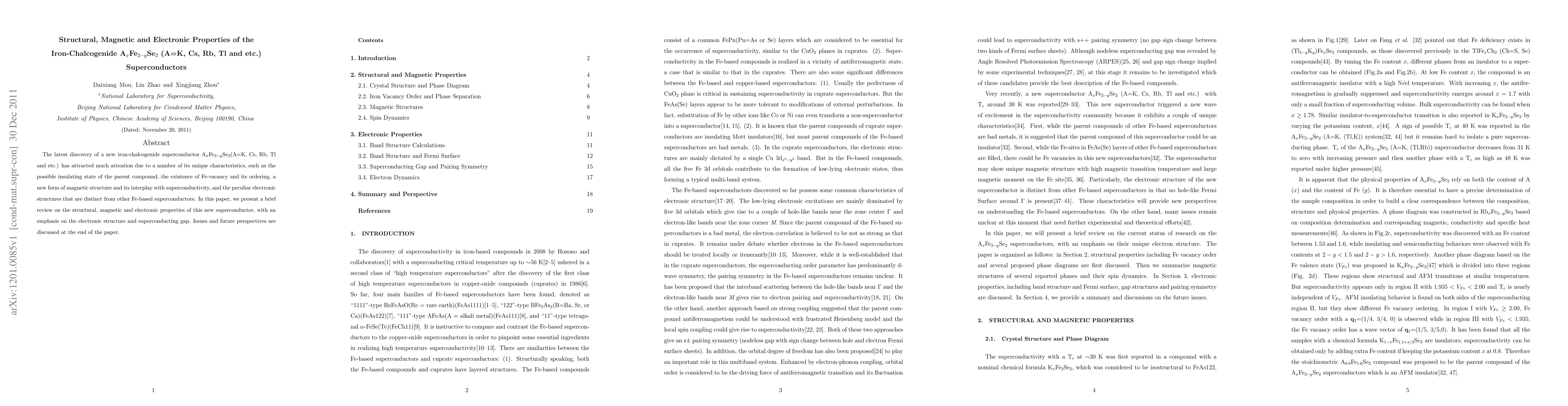 This paper reviews the structural, magnetic, and electronic properties of iron-chalcogenide superconductors A$_x$Fe$_{2-y}$Se$_2$ (A=K, Cs, Rb, Tl, etc.), focusing on their unique characteristics, including Fe-vacancy ordering, magnetic structures, and distinct electronic structures compared to other Fe-based superconductors. The paper highlights the superconducting gap and discusses future research directions.
