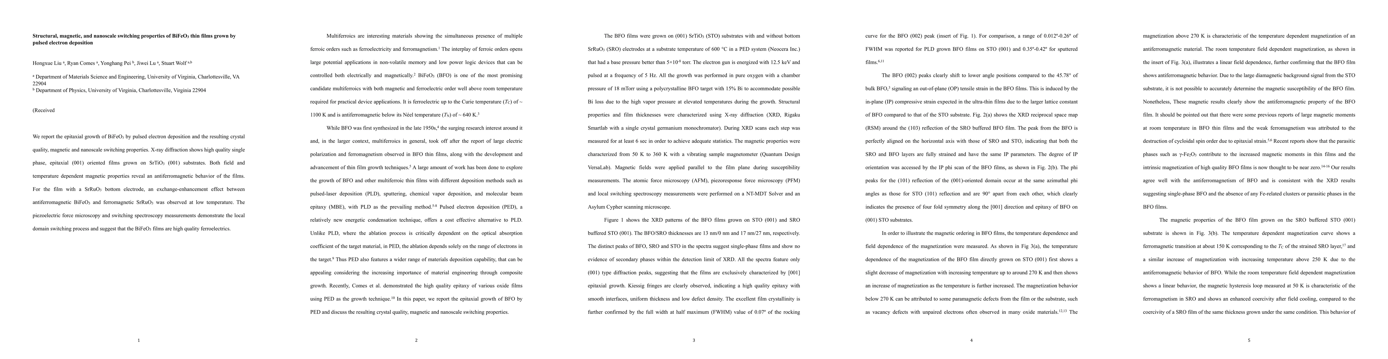 This study reports the epitaxial growth of BiFeO3 thin films via pulsed electron deposition, revealing high-quality, single-phase films with antiferromagnetic behavior and local domain switching, enhanced by a ferromagnetic bottom electrode. Piezoelectric force microscopy confirms the films' ferroelectric properties.