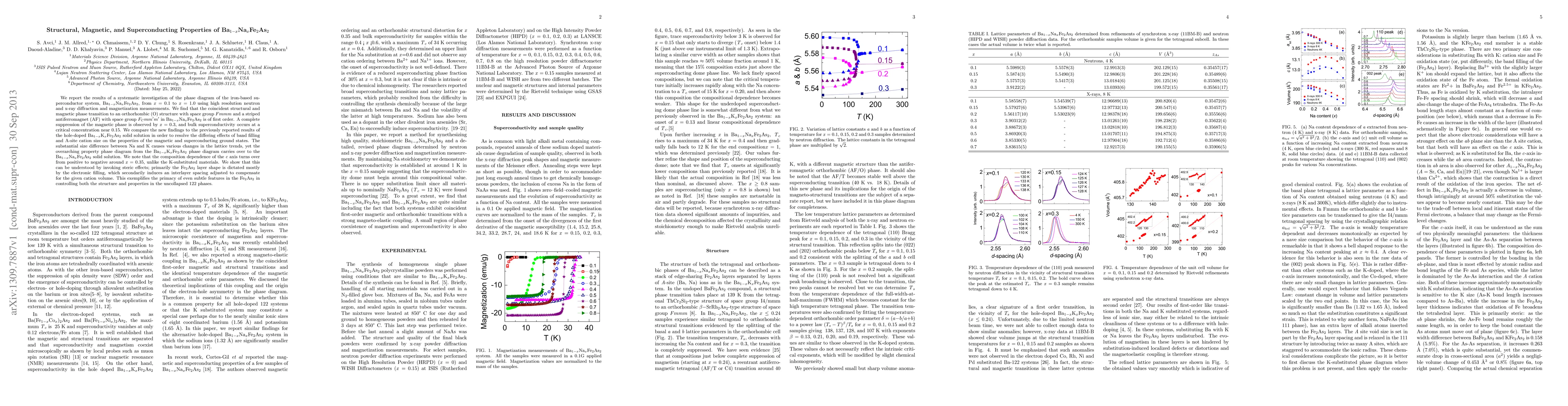 This paper investigates the phase diagram of Ba1-xNaxFe2As2, revealing a first-order transition to an orthorhombic structure with antiferromagnetic order, and identifying bulk superconductivity onset near x = 0.15. The study highlights the influence of cation size on lattice trends and structural properties, emphasizing the critical role of Fe2As2 layer geometry in determining material behavior.