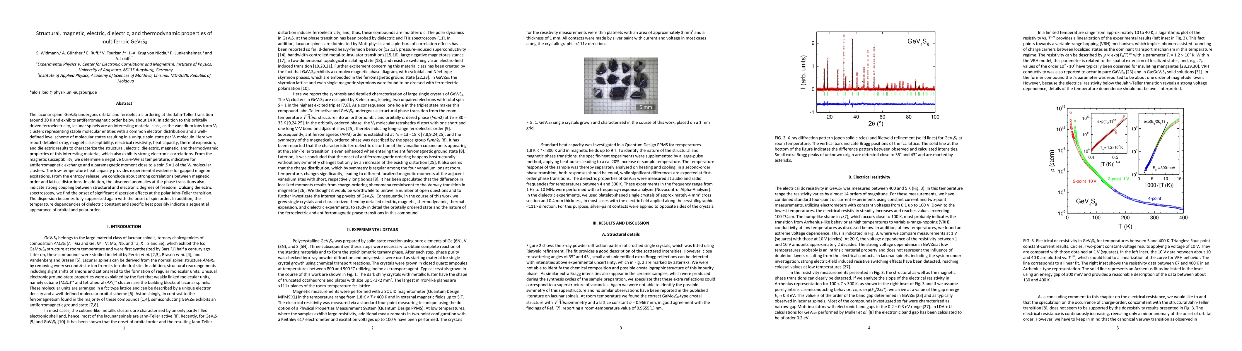The lacunar spinel GeV4S8 undergoes orbital and ferroelectric ordering at the Jahn-Teller transition around 30 K and exhibits antiferromagnetic order below about 14 K. In addition to this orbitally driven ferroelectricity, lacunar spinels are an interesting material class, as the vanadium ions form V4 clusters representing stable molecular entities with a common electron distribution and a well-defined level scheme of molecular states resulting in a unique spin state per V4 molecule. Here we report detailed x-ray, magnetic susceptibility, electrical resistivity, heat capacity, thermal expansion, and dielectric results to characterize the structural, electric, dielectric, magnetic, and thermodynamic properties of this interesting material, which also exhibits strong electronic correlations. From the magnetic susceptibility, we determine a negative Curie-Weiss temperature, indicative for antiferromagnetic exchange and a paramagnetic moment close to a spin S = 1 of the V4 molecular clusters. The low-temperature heat capacity provides experimental evidence for gapped magnon excitations. From the entropy release, we conclude about strong correlations between magnetic order and lattice distortions. In addition, the observed anomalies at the phase transitions also indicate strong coupling between structural and electronic degrees of freedom. Utilizing dielectric spectroscopy, we find the onset of significant dispersion effects at the polar Jahn-Teller transition. The dispersion becomes fully suppressed again with the onset of spin order. In addition, the temperature dependencies of dielectric constant and specific heat possibly indicate a sequential appearance of orbital and polar order.
