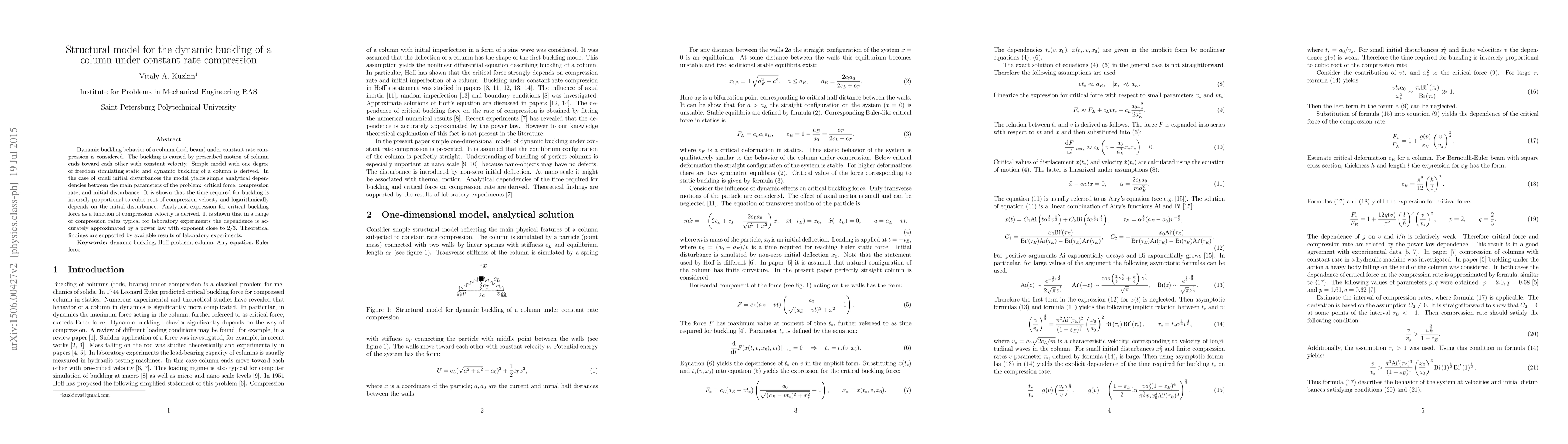 This paper develops a one-degree-of-freedom model to analyze dynamic buckling in columns under constant rate compression, deriving analytical relationships between critical force, compression velocity, and initial disturbances. The study finds that buckling time inversely correlates with the cubic root of compression velocity and logarithmically with initial disturbance, with critical force following a power law with an exponent close to 2/3.