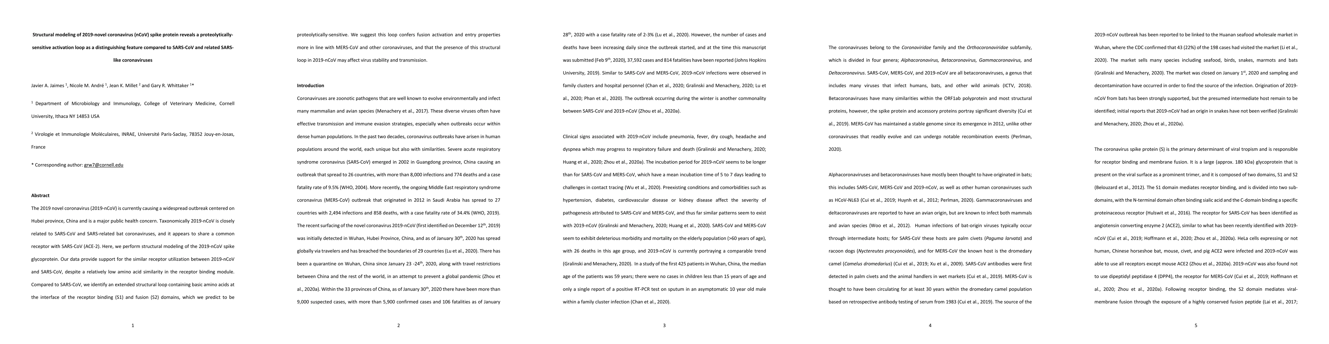 The 2019 novel coronavirus (2019-nCoV) is currently causing a widespread outbreak centered on Hubei province, China and is a major public health concern. Taxonomically 2019-nCoV is closely related to SARS-CoV and SARS-related bat coronaviruses, and it appears to share a common receptor with SARS-CoV (ACE-2). Here, we perform structural modeling of the 2019-nCoV spike glycoprotein. Our data provide support for the similar receptor utilization between 2019-nCoV and SARS-CoV, despite a relatively low amino acid similarity in the receptor binding module. Compared to SARS-CoV, we identify an extended structural loop containing basic amino acids at the interface of the receptor binding (S1) and fusion (S2) domains, which we predict to be proteolytically-sensitive. We suggest this loop confers fusion activation and entry properties more in line with MERS-CoV and other coronaviruses, and that the presence of this structural loop in 2019-nCoV may affect virus stability and transmission.