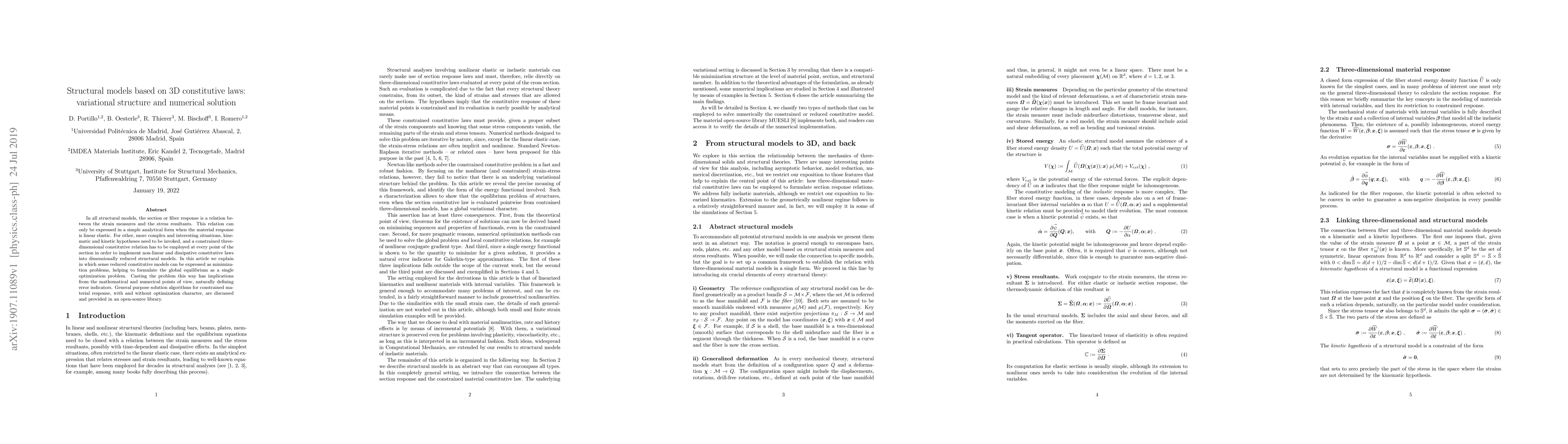 This paper explores the formulation of structural models using 3D constitutive laws through variational principles, presenting reduced models as minimization problems. It discusses numerical solution algorithms and provides an open-source library for implementing these models.