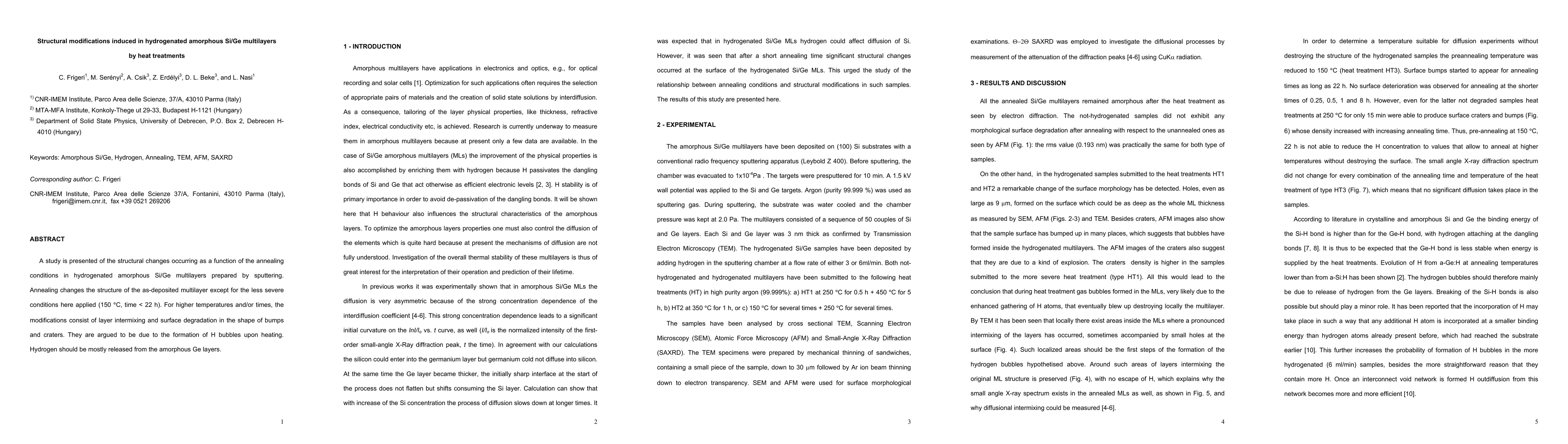 The study investigates structural changes in hydrogenated amorphous Si/Ge multilayers post-annealing, revealing that mild conditions (150°C, <22 h) do not significantly alter the structure, while higher temperatures and longer durations cause layer intermixing and surface degradation due to hydrogen bubble formation, predominantly from amorphous Ge layers.