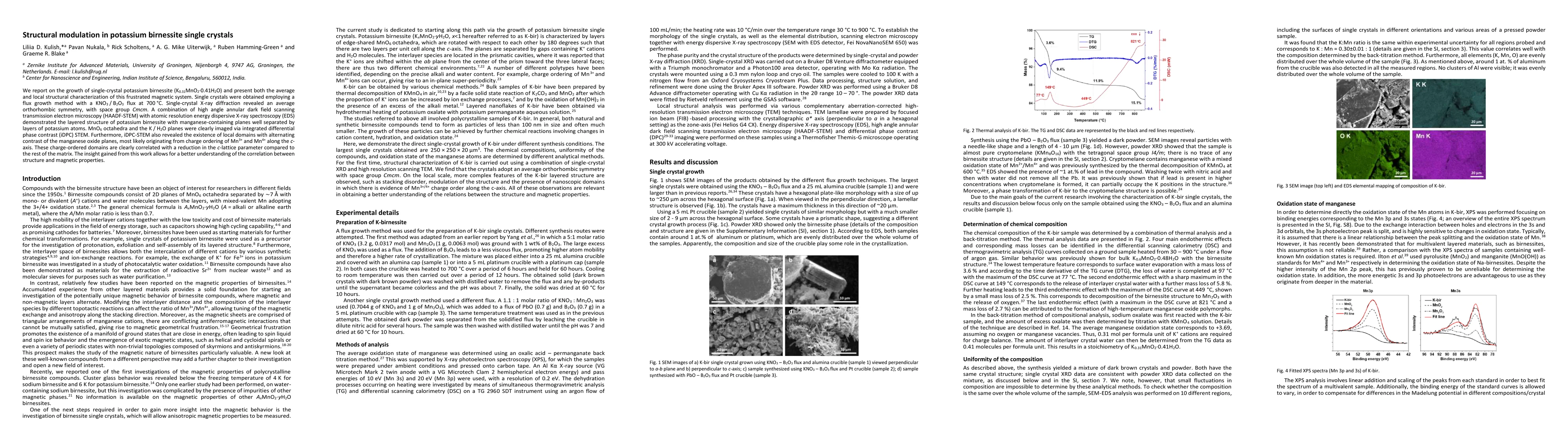 This paper reports the growth of potassium birnessite single crystals using a flux method and characterizes their average and local structures. High-resolution microscopy reveals layered manganese oxide planes separated by potassium atoms, with local domains showing charge ordering of Mn3+ and Mn4+ that correlates with a reduced c-lattice parameter.