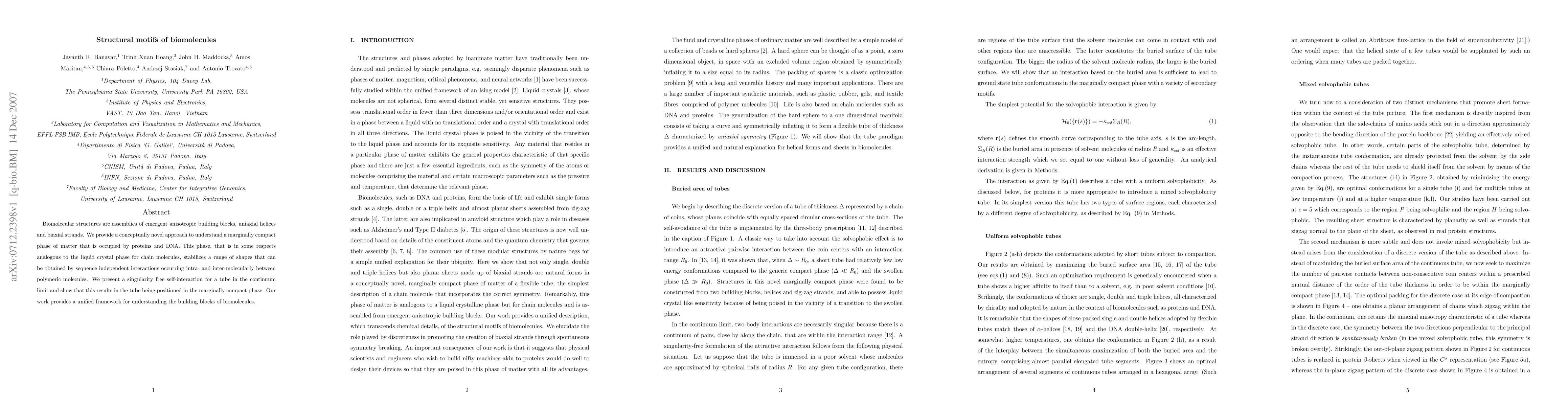 Biomolecular structures are assemblies of emergent anisotropic building modules such as uniaxial helices or biaxial strands. We provide an approach to understanding a marginally compact phase of matter that is occupied by proteins and DNA. This phase, which is in some respects analogous to the liquid crystal phase for chain molecules, stabilizes a range of shapes that can be obtained by sequence-independent interactions occurring intra- and intermolecularly between polymeric molecules. We present a singularityfree self-interaction for a tube in the continuum limit and show that this results in the tube being positioned in the marginally compact phase. Our work provides a unified framework for understanding the building blocks of biomolecules.