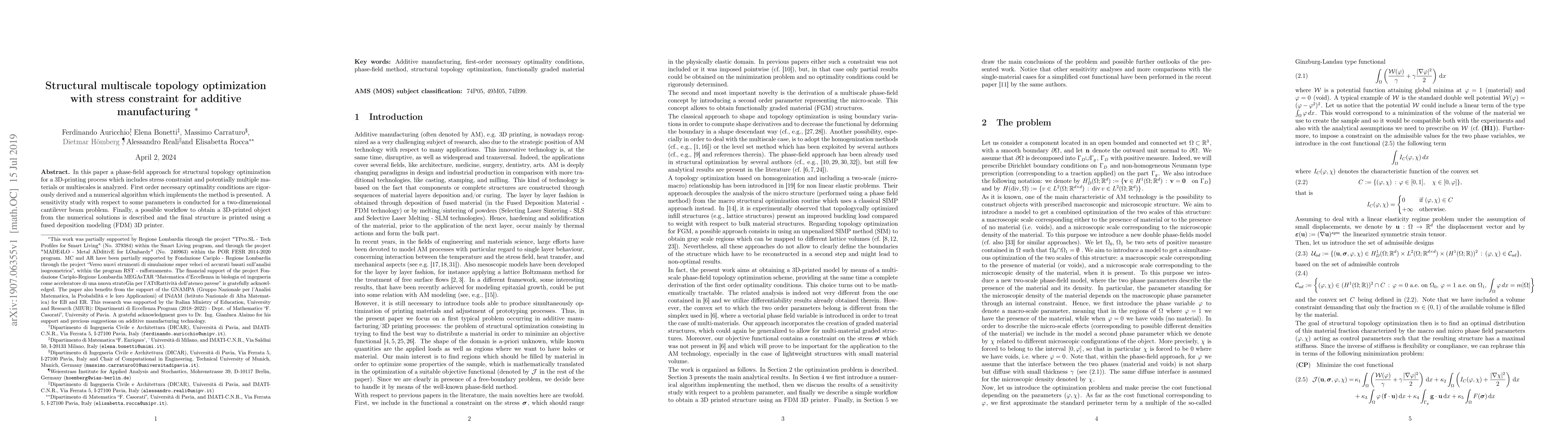 In this paper a phase-field approach for structural topology optimization for a 3D-printing process which includes stress constraint and potentially multiple materials or multiscales is analyzed. First order necessary optimality conditions are rigorously derived and a numerical algorithm which implements the method is presented. A sensitivity study with respect to some parameters is conducted for a two-dimensional cantilever beam problem. Finally, a possible workflow to obtain a 3D-printed object from the numerical solutions is described and the final structure is printed using a fused deposition modeling (FDM) 3D printer.