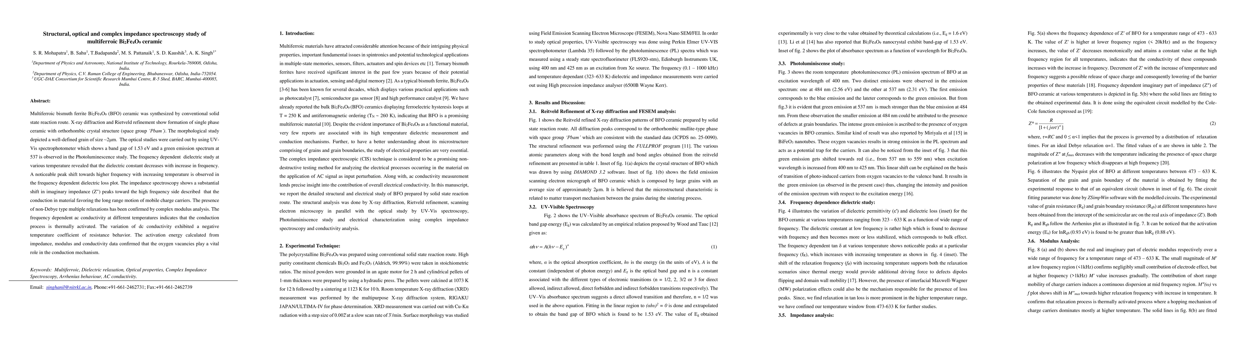 Multiferroic bismuth ferrite Bi_2Fe_4O_9 (BFO) ceramic was synthesized by conventional solid state reaction route. X-ray diffraction and Rietveld refinement show formation of single phase ceramic with orthorhombic crystal structure (space group Pbam). The morphological study depicted a well-defined grain of size $\simeq$2{\mu}m. The optical studies were carried out by using UV-Vis spectrophotometer which shows a band gap of 1.53 eV and a green emission spectrum at 537 is observed in the Photoluminescence study. The frequency dependent dielectric study at various temperature revealed that the dielectric constant decreases with increase in frequency. A noticeable peak shift towards higher frequency with increasing temperature is observed in the frequency dependent dielectric loss plot. The impedance spectroscopy shows a substantial shift in imaginary impedance (Z") peaks toward the high frequency side described that the conduction in material favoring the long range motion of mobile charge carriers. The presence of non-Debye type multiple relaxations has been confirmed by complex modulus analysis. The frequency dependent ac conductivity at different temperatures indicates that the conduction process is thermally activated. The variation of dc conductivity exhibited a negative temperature coefficient of resistance behavior. The activation energy calculated from impedance, modulus and conductivity data confirmed that the oxygen vacancies play a vital role in the conduction mechanism.