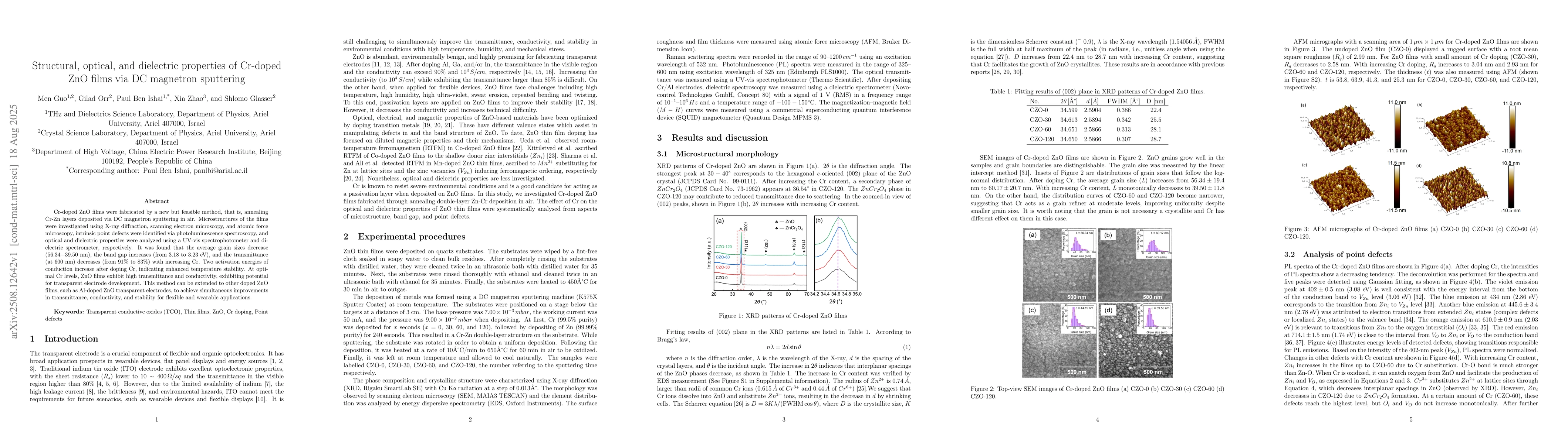 Cr-doped ZnO films were fabricated by a new but feasible method, that is, annealing Cr-Zn layers deposited via DC magnetron sputtering in air. Microstructures of the films were investigated using X-ray diffraction, scanning electron microscopy, and atomic force microscopy, intrinsic point defects were identified via photoluminescence spectroscopy, and optical and dielectric properties were analyzed using a UV-vis spectrophotometer and dielectric spectrometer, respectively. It was found that the average grain sizes decrease (56.34 - 39.50 nm), the band gap increases (from 3.18 to 3.23 eV), and the transmittance (at 600 nm) decreases (from 91% to 83%) with increasing Cr. Two activation energies of conduction increase after doping Cr, indicating enhanced temperature stability. At optimal Cr levels, ZnO films exhibit high transmittance and conductivity, exhibiting potential for transparent electrode development. This method can be extended to other doped ZnO films, such as Al-doped ZnO transparent electrodes, to achieve simultaneous improvements in transmittance, conductivity, and stability for flexible and wearable applications.