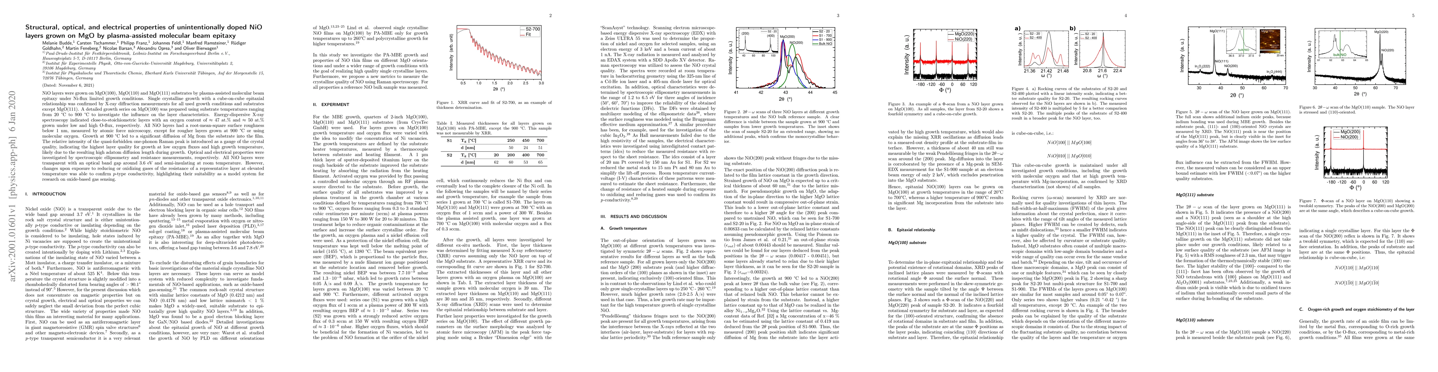 This study investigates the structural, optical, and electrical properties of unintentionally doped NiO layers grown on various MgO substrates via plasma-assisted molecular beam epitaxy. The layers exhibit high crystal quality and transparency with an optical bandgap of ~3.6 eV, and semi-insulating behavior at room temperature, with p-type conductivity confirmed under gas exposure.