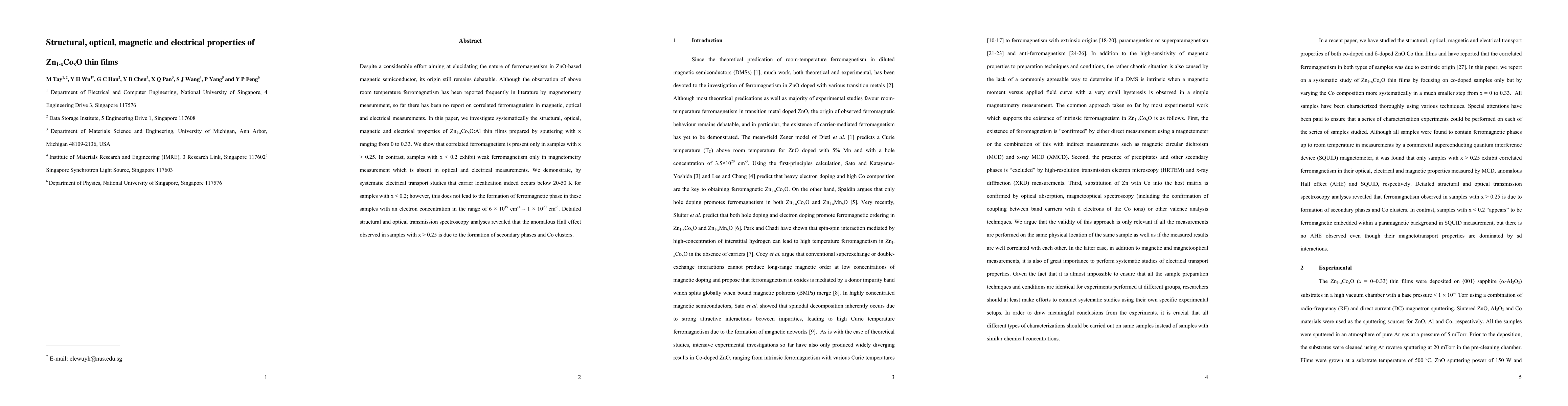 Despite a considerable effort aiming at elucidating the nature of ferromagnetism in ZnO-based magnetic semiconductor, its origin still remains debatable. Although the observation of above room temperature ferromagnetism has been reported frequently in the literature by magnetometry measurement, so far there has been no report on correlated ferromagnetism in magnetic, optical and electrical measurements. In this paper, we investigate systematically the structural, optical, magnetic and electrical properties of Zn1-x Co (x) O:Al thin films prepared by sputtering with x ranging from 0 to 0.33. We show that correlated ferromagnetism is present only in samples with x > 0.25. In contrast, samples with x < 0.2 exhibit weak ferromagnetism only in magnetometry measurement which is absent in optical and electrical measurements. We demonstrate, by systematic electrical transport studies that carrier localization indeed occurs below 20-50 K for samples with x < 0.2; however, this does not lead to the formation of ferromagnetic phase in these samples with an electron concentration in the range of 6 x 10(19) cm(-3) 1 x 10(20) cm(-3). Detailed structural and optical transmission spectroscopy analyses revealed that the anomalous Hall effect observed in samples with x > 0.25 is due to the formation of secondary phases and Co clusters.
