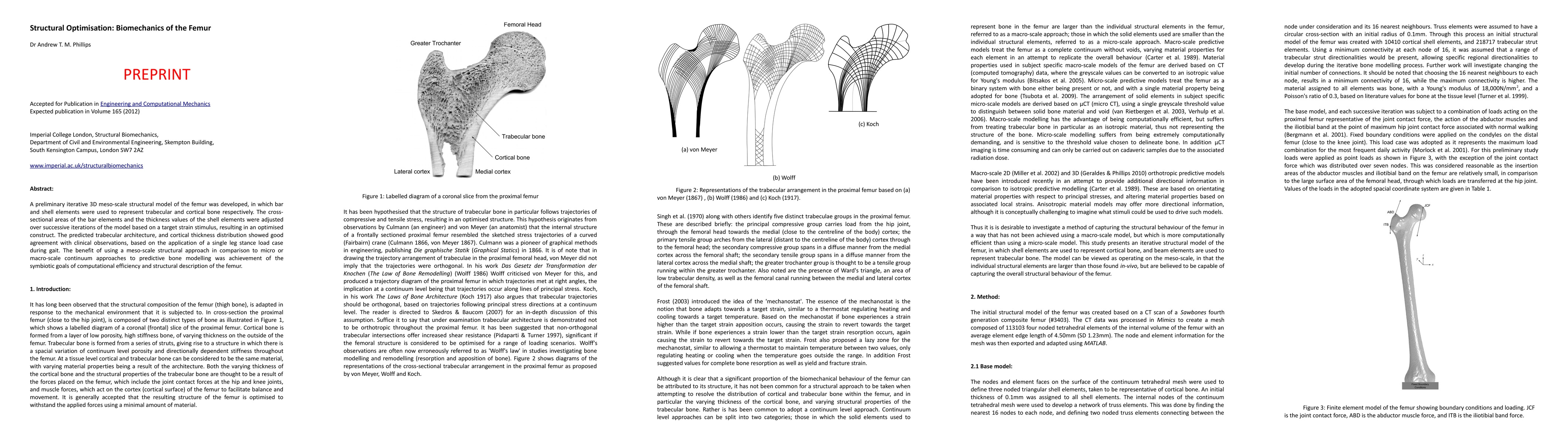 A preliminary iterative 3D meso-scale structural model of the femur was developed, in which bar and shell elements were used to represent trabecular and cortical bone respectively. The cross-sectional areas of the bar elements and the thickness values of the shell elements were adjusted over successive iterations of the model based on a target strain stimulus, resulting in an optimised construct. The predicted trabecular architecture, and cortical thickness distribution showed good agreement with clinical observations, based on the application of a single leg stance load case during gait. The benefit of using a meso-scale structural approach in comparison to micro or macro-scale continuum approaches to predictive bone modelling was achievement of the symbiotic goals of computational efficiency and structural description of the femur.