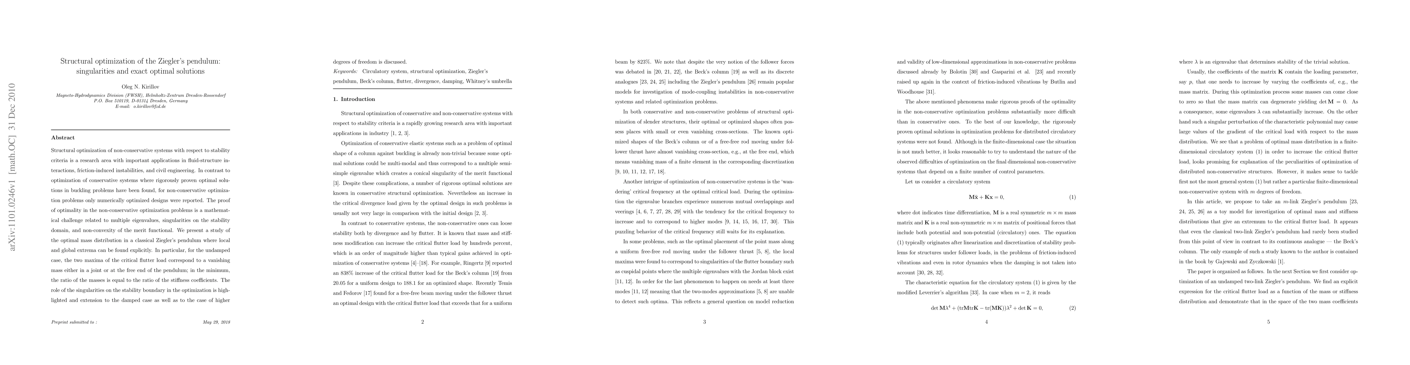 Structural optimization of non-conservative systems with respect to stability criteria is a research area with important applications in fluid-structure interactions, friction-induced instabilities, and civil engineering. In contrast to optimization of conservative systems where rigorously proven optimal solutions in buckling problems have been found, for non-conservative optimization problems only numerically optimized designs were reported. The proof of optimality in the non-conservative optimization problems is a mathematical challenge related to multiple eigenvalues, singularities on the stability domain, and non-convexity of the merit functional. We present a study of the optimal mass distribution in a classical Ziegler's pendulum where local and global extrema can be found explicitly. In particular, for the undamped case, the two maxima of the critical flutter load correspond to a vanishing mass either in a joint or at the free end of the pendulum; in the minimum, the ratio of the masses is equal to the ratio of the stiffness coefficients. The role of the singularities on the stability boundary in the optimization is highlighted and extension to the damped case as well as to the case of higher degrees of freedom is discussed.