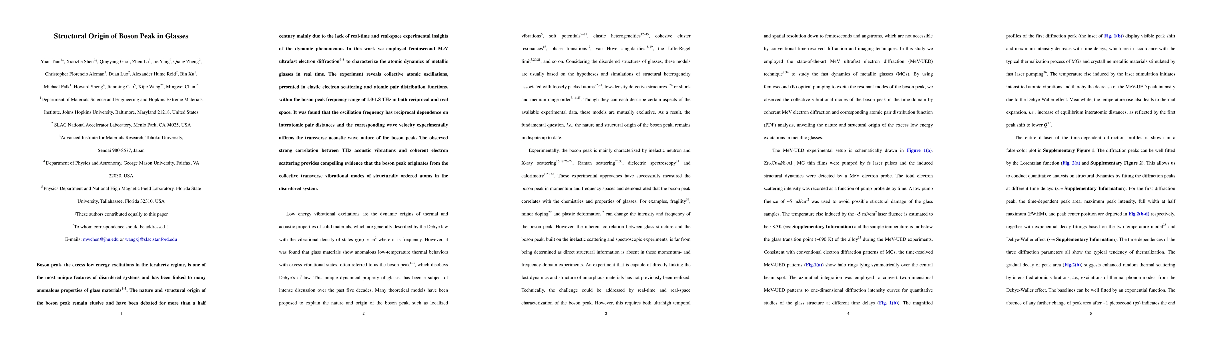 Boson peak, the excess low energy excitations in the terahertz regime, is one of the most unique features of disordered systems and has been linked to many anomalous properties of glass materials. The nature and structural origin of the boson peak remain elusive and have been debated for more than a half century mainly due to the lack of real-time and real-space experimental insights of the dynamic phenomenon. In this work we employed femtosecond MeV ultrafast electron diffraction to characterize the atomic dynamics of metallic glasses in real time. The experiment reveals collective atomic oscillations, presented in elastic electron scattering and atomic pair distribution functions, within the boson peak frequency range of 1.0-1.8 THz in both reciprocal and real space. It was found that the oscillation frequency has reciprocal dependence on interatomic pair distances and the corresponding wave velocity experimentally affirms the transverse acoustic wave nature of the boson peak. The observed strong correlation between THz acoustic vibrations and coherent electron scattering provides compelling evidence that the boson peak originates from the collective transverse vibrational modes of structurally ordered atoms in the disordered system.