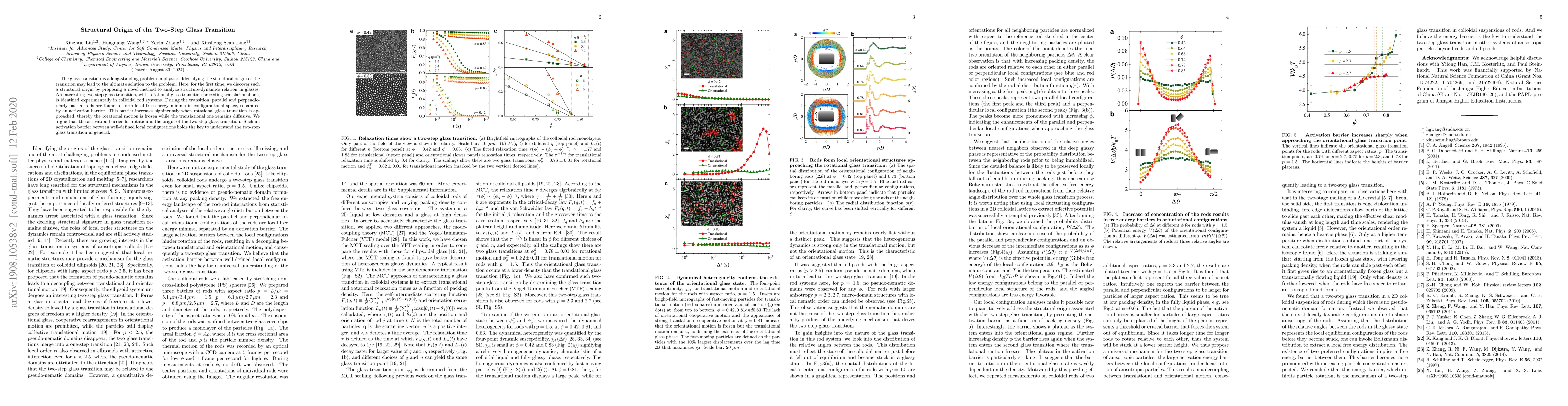 The glass transition is a long-standing problem in physics. Identifying the structural origin of the transition may lead to the ultimate solution to the problem. Here, for the first time, we discover such a structural origin by proposing a novel method to analyze structure-dynamics relation in glasses. An interesting two-step glass transition, with rotational glass transition preceding translational one, is identified experimentally in 2D colloidal rod systems. During the transition, parallel and perpendicularly packed rods are found to form local free energy minima in configurational space, separated by an activation barrier. This barrier increases significantly when rotational glass transition is approached; thereby the rotational motion is frozen while the translational one remains diffusive. We argue that the activation barrier for rotation is the origin of the two-step glass transition. Such an activation barrier between well-defined local configurations holds the key to understand the two-step glass transition in general.