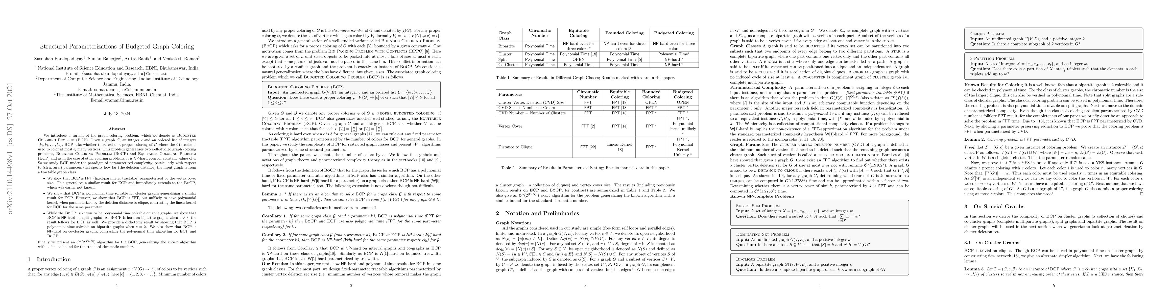 We introduce a variant of the graph coloring problem, which we denote as {\sc Budgeted Coloring Problem} (\bcp). Given a graph $G$, an integer $c$ and an ordered list of integers $\{b_1, b_2, \ldots, b_c\}$, \bcp asks whether there exists a proper coloring of $G$ where the $i$-th color is used to color at most $b_i$ many vertices. This problem generalizes two well-studied graph coloring problems, {\sc Bounded Coloring Problem} (\bocp) and {\sc Equitable Coloring Problem} (\ecp) and as in the case of other coloring problems, it is \nph even for constant values of $c$. So we study \bcp under the paradigm of parameterized complexity. \begin{itemize} \item We show that \bcp is \fpt (fixed-parameter tractable) parameterized by the vertex cover size. This generalizes a similar result for \ecp and immediately extends to the \bocp, which was earlier not known. \item We show that \bcp is polynomial time solvable for cluster graphs generalizing a similar result for \ecp. However, we show that \bcp is \fpt, but unlikely to have polynomial kernel, when parameterized by the deletion distance to clique, contrasting the linear kernel for \ecp for the same parameter. \item While the \bocp is known to be polynomial time solvable on split graphs, we show that \bcp is \nph on split graphs. As \bocp is hard on bipartite graphs when $c>3$, the result follows for \bcp as well. We provide a dichotomy result by showing that \bcp is polynomial time solvable on bipartite graphs when $c=2$. We also show that \bcp is \nph on co-cluster graphs, contrasting the polynomial time algorithm for \ecp and \bocp. \end{itemize} Finally we present an $\mathcal{O}^*(2^{|V(G)|})$ algorithm for the \bcp, generalizing the known algorithm with a similar bound for the standard chromatic number.