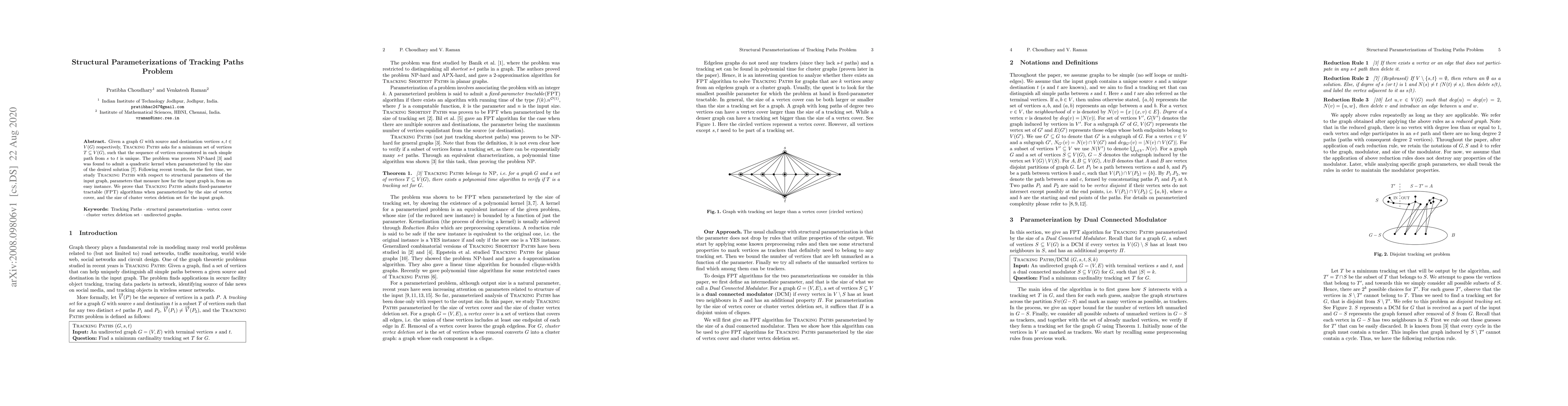 Given a graph $G$ with source and destination vertices $s,t\in V(G)$ respectively, \textsc{Tracking Paths} asks for a minimum set of vertices $T\subseteq V(G)$, such that the sequence of vertices encountered in each simple path from $s$ to $t$ is unique. The problem was proven \textsc{NP}-hard \cite{tr-j} and was found to admit a quadratic kernel when parameterized by the size of the desired solution \cite{quadratic}. Following recent trends, for the first time, we study \textsc{Tracking Paths} with respect to structural parameters of the input graph, parameters that measure how far the input graph is, from an easy instance. We prove that \textsc{Tracking Paths} admits fixed-parameter tractable (\textsc{FPT}) algorithms when parameterized by the size of vertex cover, and the size of cluster vertex deletion set for the input graph.