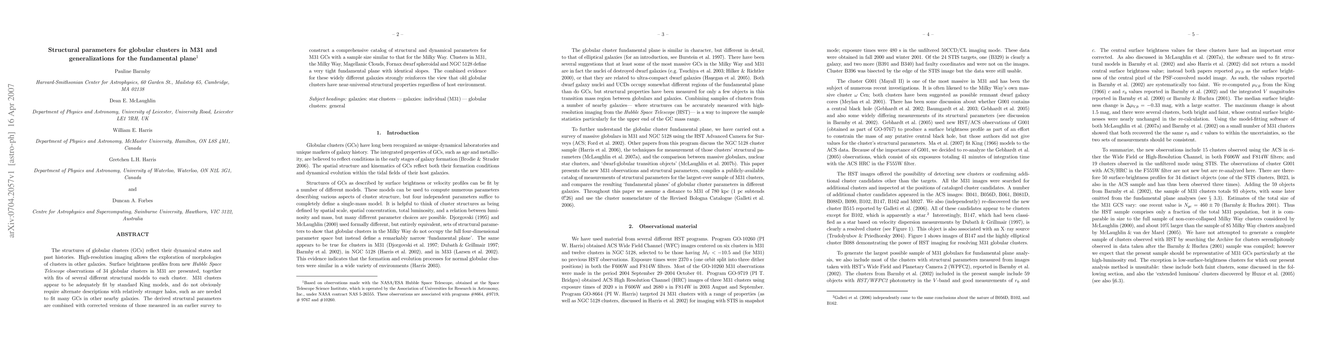 This paper presents structural parameters of 34 globular clusters in M31 derived from Hubble Space Telescope observations, revealing that M31 clusters fit standard King models. The study also establishes a fundamental plane for globular clusters across various galaxies, indicating near-universal structural properties for old globular clusters regardless of their host environment.