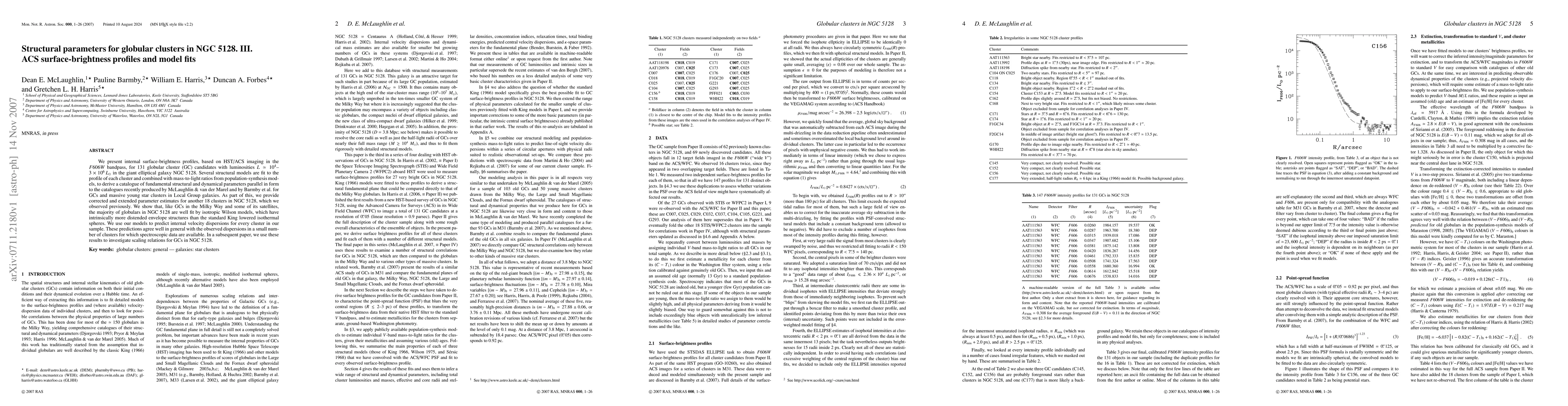 This paper presents surface-brightness profiles for 131 globular cluster candidates in NGC 5128, derived from HST/ACS imaging, and uses structural models to determine their fundamental parameters. The majority of clusters are well described by isotropic Wilson models, which predict internal velocity dispersions that generally agree with available spectroscopic data.