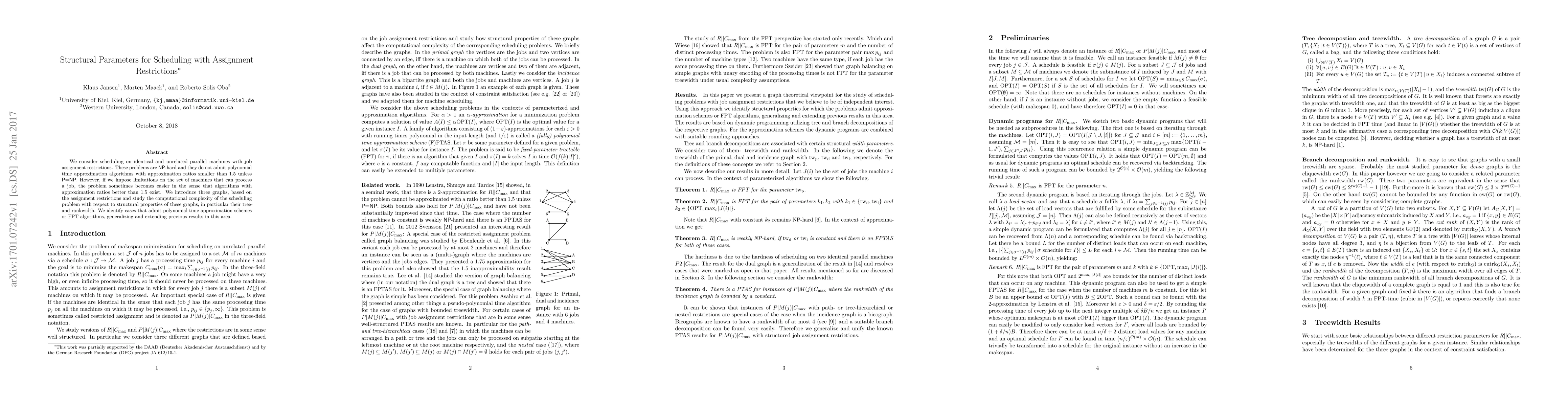 This paper explores scheduling problems on parallel machines with job assignment restrictions, identifying structural parameters like tree- and rankwidth that enable better approximation algorithms. It introduces three graphs based on these restrictions and finds cases that allow for polynomial time approximation schemes or FPT algorithms, extending previous research.