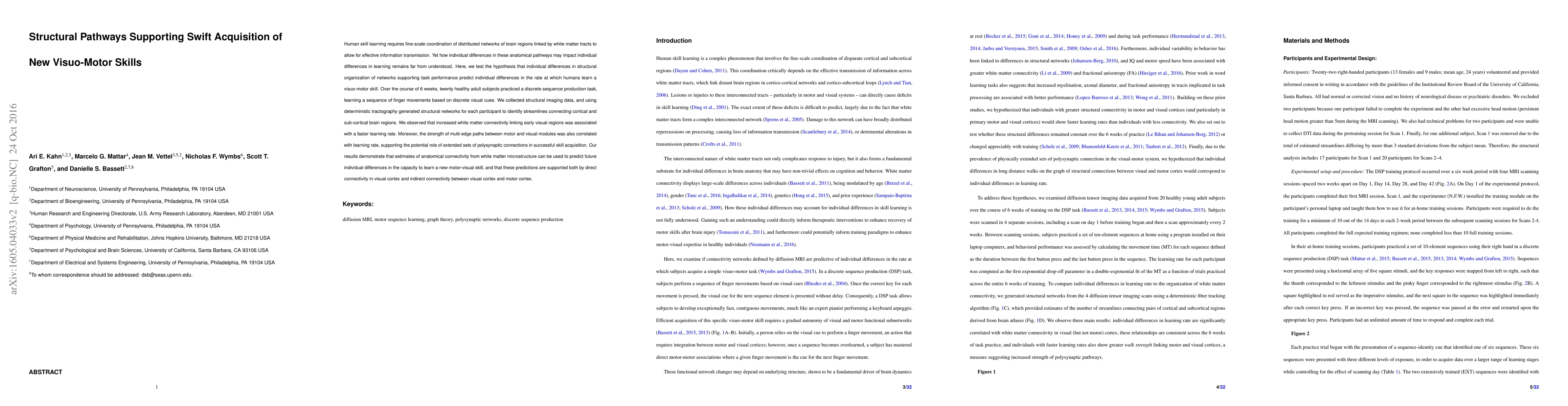 This study investigates how individual differences in brain structural connectivity influence the rate of learning new visuo-motor skills. Findings show that enhanced white matter connectivity between early visual regions and polysynaptic connections between motor and visual networks correlate with faster skill acquisition, highlighting the predictive power of structural networks in learning capacity.