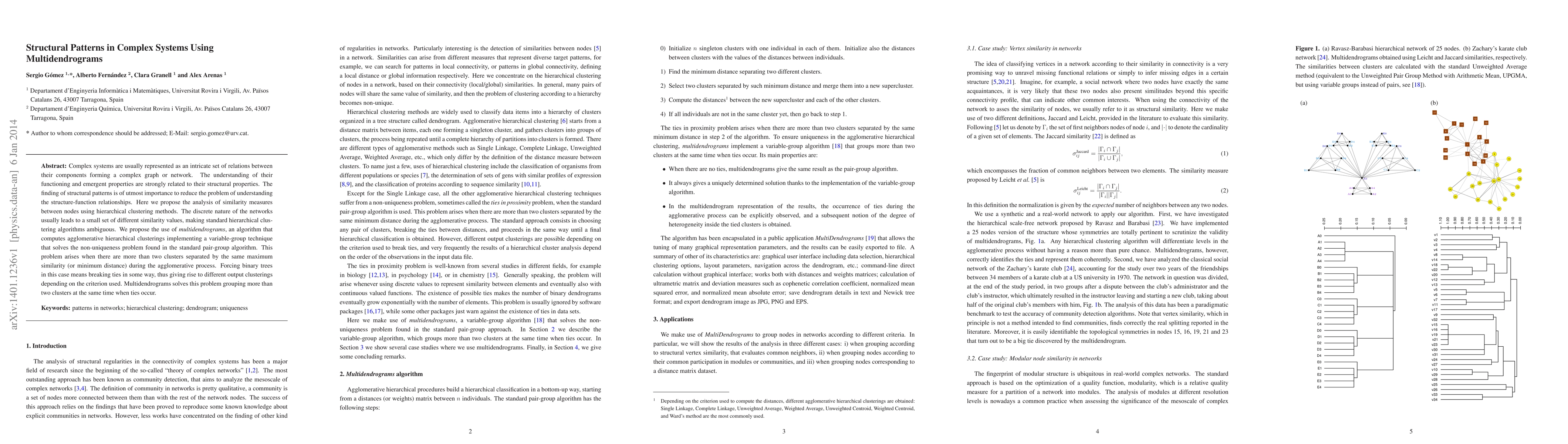 Complex systems are usually represented as an intricate set of relations between their components forming a complex graph or network. The understanding of their functioning and emergent properties are strongly related to their structural properties. The finding of structural patterns is of utmost importance to reduce the problem of understanding the structure-function relationships. Here we propose the analysis of similarity measures between nodes using hierarchical clustering methods. The discrete nature of the networks usually leads to a small set of different similarity values, making standard hierarchical clustering algorithms ambiguous. We propose the use of "multidendrograms", an algorithm that computes agglomerative hierarchical clusterings implementing a variable-group technique that solves the non-uniqueness problem found in the standard pair-group algorithm. This problem arises when there are more than two clusters separated by the same maximum similarity (or minimum distance) during the agglomerative process. Forcing binary trees in this case means breaking ties in some way, thus giving rise to different output clusterings depending on the criterion used. Multidendrograms solves this problem grouping more than two clusters at the same time when ties occur.