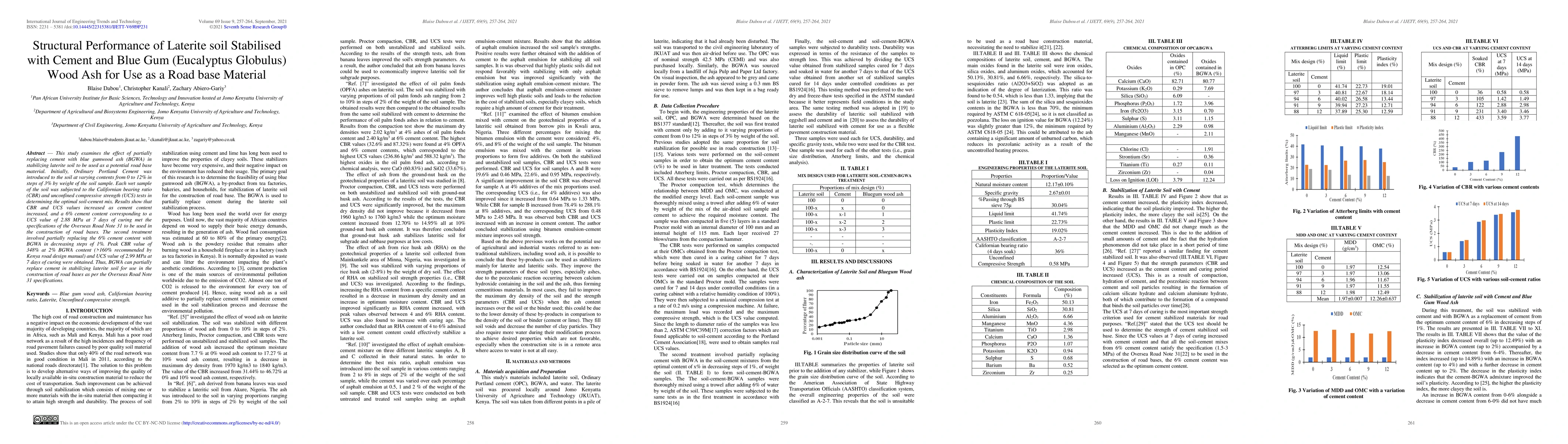 This study examines the effect of partially replacing cement with blue gumwood ash (BGWA) in stabilizing laterite soil to be used as a potential road base material. Initially, Ordinary Portland Cement was introduced to the soil at varying contents from 0 to 12% in steps of 3% by weight of the soil sample. Each wet sample of the soil was subjected to the Californian bearing ratio (CBR) and unconfined compressive strength (UCS) tests in determining the optimal soil-cement mix. Results show that CBR and UCS values increased as cement content increased, and a 6% cement content corresponding to a UCS value of 2.88 MPa at 7 days of curing met the specifications of the Overseas Road Note 31 to be used in the construction of road bases. The second treatment involved partially replacing the 6% cement content with BGWA in decreasing steps of 1%. Peak CBR value of 348% at 2% BGWA content (>160% recommended by Kenya road design manual) and UCS value of 2.99 MPa at 7 days of curing were obtained. Thus, BGWA can partially replace cement in stabilizing laterite soil for use in the construction of road bases as per the Overseas Road Note 31 specifications.