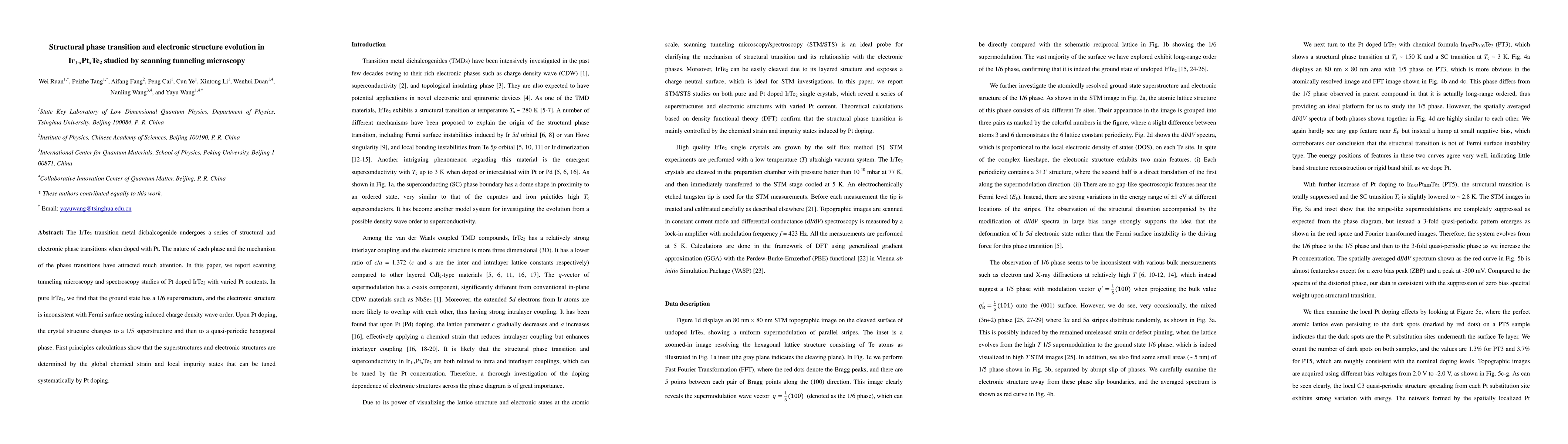 This paper investigates the structural and electronic phase transitions in IrTe2 doped with Pt using scanning tunneling microscopy. Pure IrTe2 exhibits a 1/6 superstructure and unconventional electronic structure, while Pt doping induces a 1/5 superstructure and eventually a quasi-periodic hexagonal phase, with first principles calculations attributing these changes to chemical strain and local impurity states.