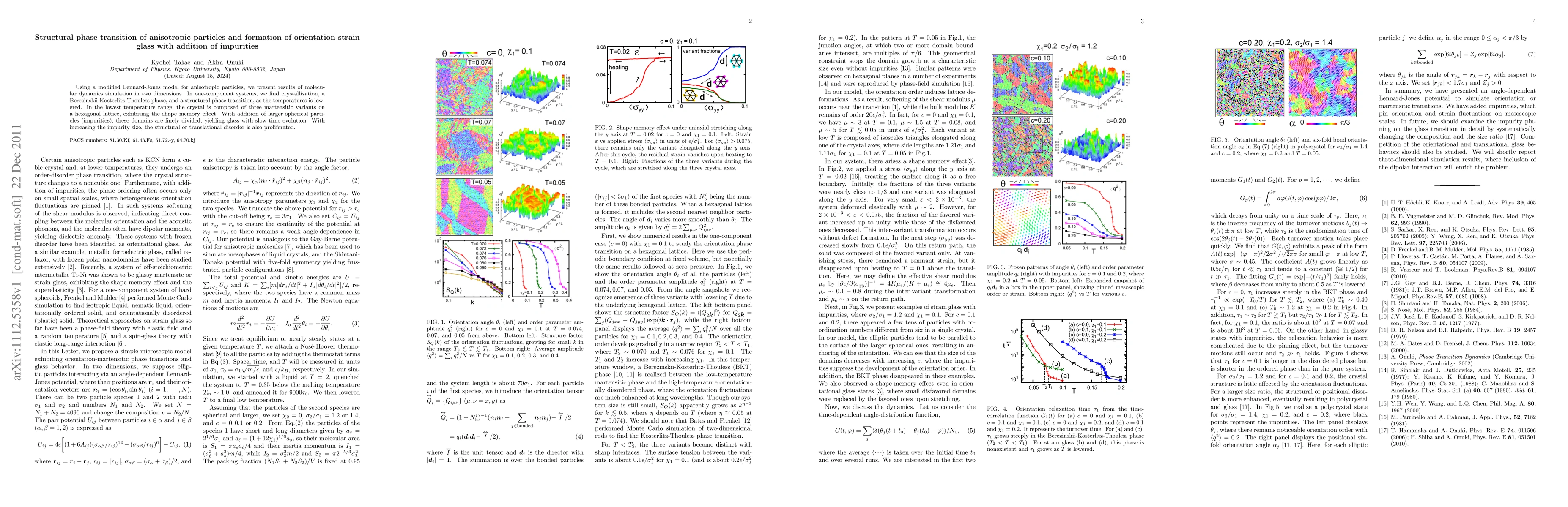 Using a modified Lennard-Jones model for anisotropic particles, we present results of molecular dynamics simulation in two dimensions. In one-component systems, we find crystallization, a Berezinskii-Kosterlitz-Thouless phase, and a structural phase transition, as the temperatures is lowered. In the lowest temperature range, the crystal is composed of three martensitic variants on a hexagonal lattice, exhibiting the shape memory effect. With addition of larger spherical particles (impurities), these domains are finely divided, yielding glass with slow time evolution. With increasing the impurity size, the structural or translational disorder is also proliferated.